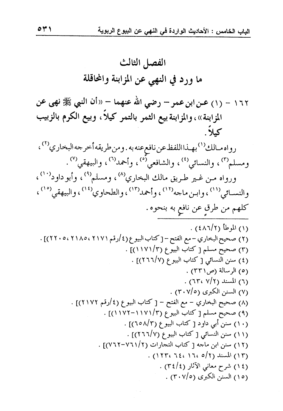 162 - (1) عن ابن عمر - رضي الله عنهما - "أن النبي صلى الله عليه وسلم نهى عن المزابنة"، والمزابنة بيع الثمر بالتمر كيلاً، وبيع الكرم بالزبيب كيلاً.