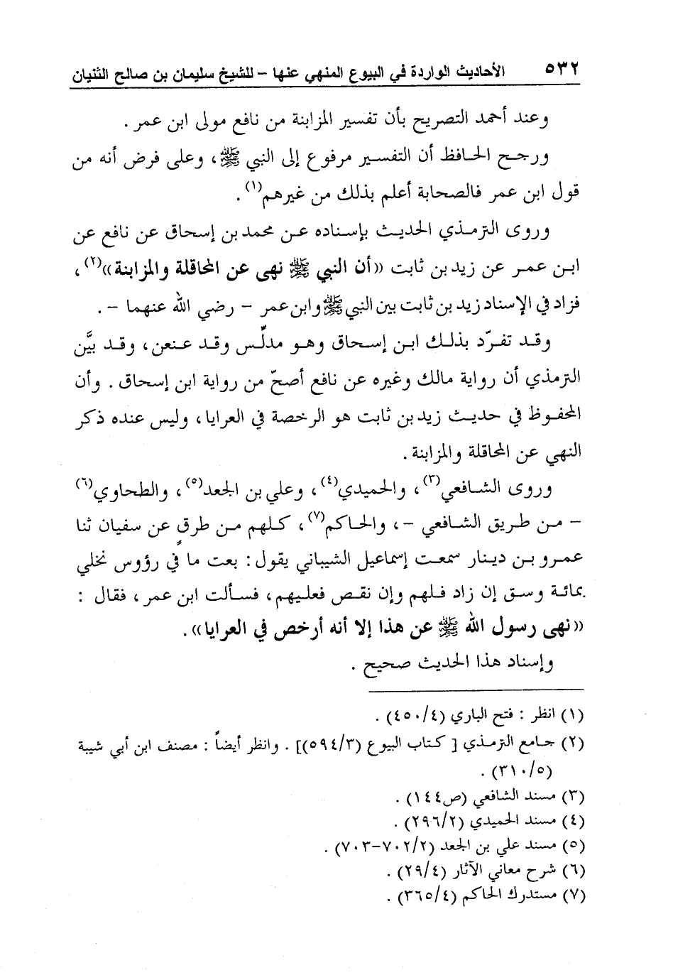 وقد تفرّد بذلك ابن إسحاق وهو مدلِّس وقد عنعن، وقد بيَّن الترمذي أن رواية مالك وغيره عن نافع أصحّ من رواية ابن إسحاق. وأن المحفوظ في حديث زيد بن ثابت هو الرخصة في العرايا، وليس عنده ذكر النهي عن المحاقلة والمزابنة.