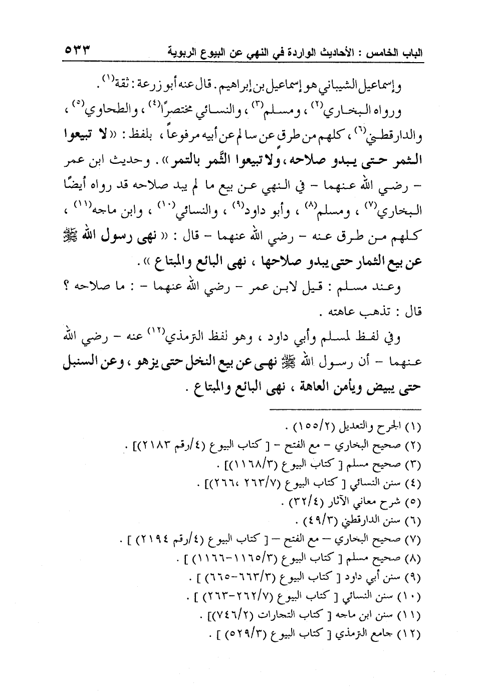 ورواه البخاري2، ومسلم3، والنسائي مختصرًا4، والطحاوي5، والدارقطني6، كلهم من طرقٍ عن سالم عن أبيه مرفوعاً، بلفظ: "لا تبيعوا الثمر حتى يبدو صلاحه، ولا تبيعوا الثَّمر بالتمر". وحديث ابن عمر - رضي الله عنهما - في النهي عن بيع ما لم يبد صلاحه قد رواه أيضًا البخاري7، ومسلم8، وأبو داود9، والنسائي10، وابن ماجه11، كلهم من طرق عنه - رضي الله عنهما - قال: "نهى رسول الله صلى الله عليه وسلم عن بيع الثمار حتى يبدو صلاحها، نهى البائع والمبتاع".