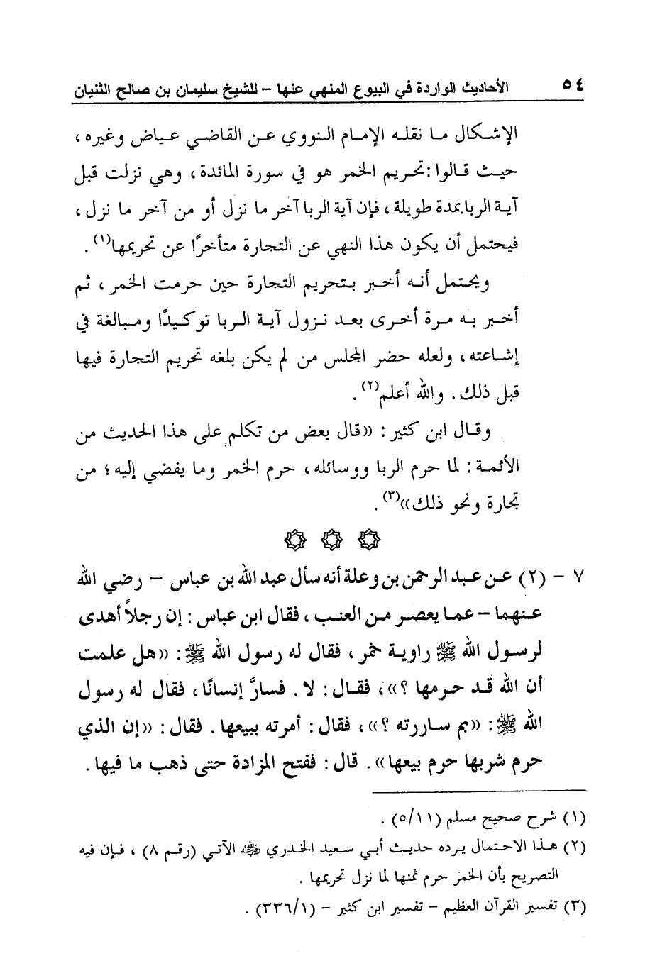 7 - (2) عن عبد الرحمن بن وعلة أنه سأل عبد الله بن عباس - رضي الله عنهما - عما يعصر من العنب، فقال ابن عباس: إن رجلاً أهدى لرسول الله صلى الله عليه وسلم راوية خمر، فقال له رسول الله صلى الله عليه وسلم: " هل علمت أن الله قد حرمها؟ "، فقال: لا. فسارَّ إنسانًا، فقال له رسول الله صلى الله عليه وسلم: " بم ساررته؟ "، فقال: أمرته ببيعها. فقال: " إن الذي حرم شربها حرم بيعها". قال: ففتح المزادة حتى ذهب ما فيها.