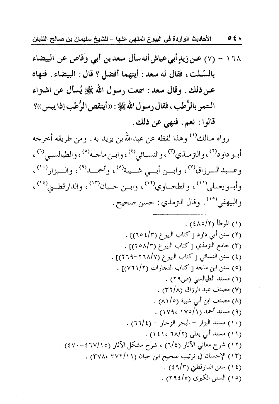 168 - (7) عن زيدٍ أبي عياش أنه سأل سعد بن أبي وقاص عن البيضاء بالسّلت، فقال له سعد: أيتهما أفضل؟ قال: البيضاء. فنهاه عن ذلك. وقال سعد: "سمعت رسول الله صلى الله عليه وسلم يُسأل عن شراء التمر بالرُّطب، فقال رسول الله صلى الله عليه وسلم: "أينقص الرُّطب إذا يبس"؟ قالوا: نعم. فنهى عن ذلك".