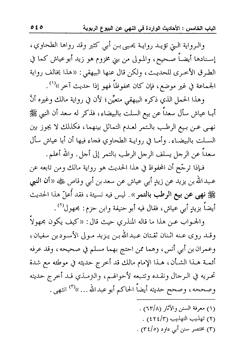 فإذا ترجّح أن المحفوظ في هذا الحديث هو رواية مالك ومن تابعه عن عبد الله بن يزيد عن زيدٍ أبي عياش عن سعد بن أبي وقاص رضي الله عنه "أن النبي صلى الله عليه وسلم نهى عن بيع الرطب بالتمر". ليس فيه نسيئة، فقد أُعلّ هذا الحديث أيضاً بزيدٍ أبي عياش، فقال فيه أبو حنيفة وابن حزم: مجهول2.
