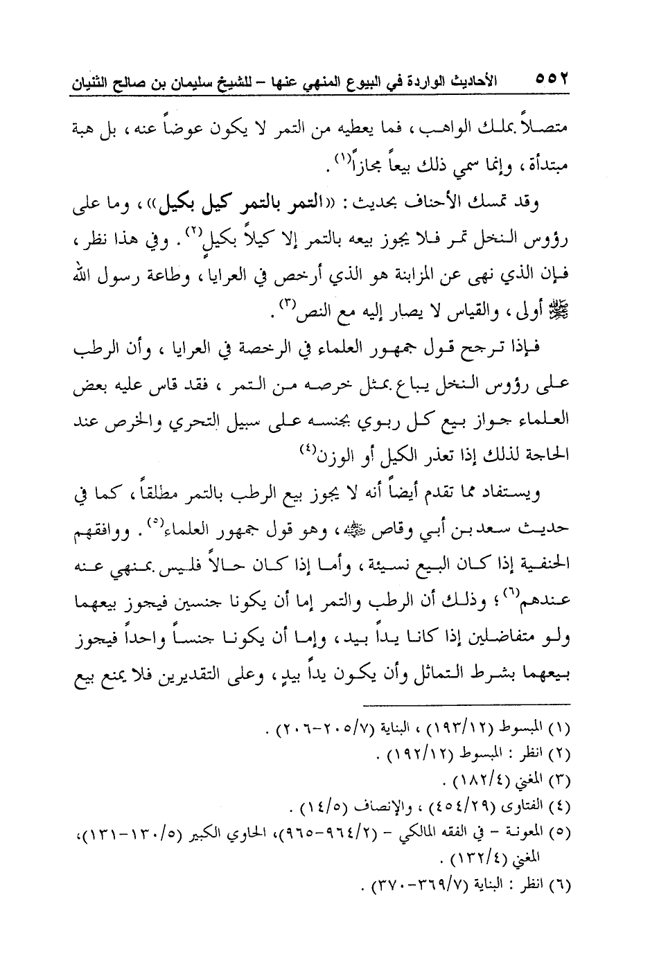ويستفاد مما تقدم أيضاً أنه لا يجوز بيع الرطب بالتمر مطلقاً، كما في حديث سعد بن أبي وقاص رضي الله عنه، وهو قول جمهور العلماء5. ووافقهم الحنفية إذا كان البيع نسيئة، وأما إذا كان حالاً فليس بمنهي عنه عندهم6؛ وذلك أن الرطب والتمر إما أن يكونا جنسين فيجوز بيعهما ولو متفاضلين إذا كانا يداً بيد، وإما أن يكونا جنساً واحداً فيجوز بيعهما بشرط التماثل وأن يكون يداً بيدٍ، وعلى التقديرين فلا يمنع بيع