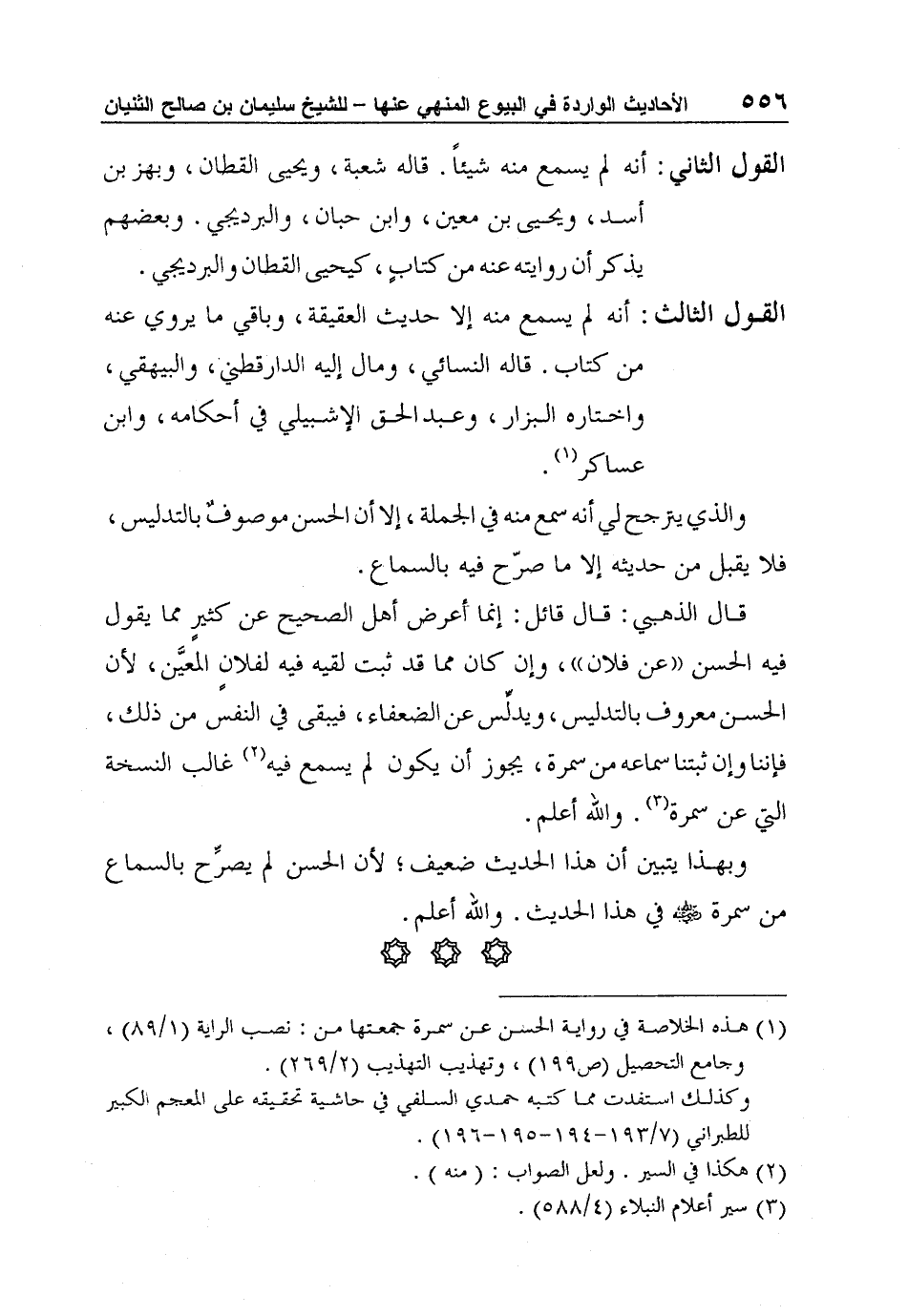 قال الذهبي: قال قائل: إنما أعرض أهل الصحيح عن كثيرٍ مما يقول فيه الحسن "عن فلان"، وإن كان مما قد ثبت لقيه فيه لفلانٍ المعيَّن، لأن الحسن معروف بالتدليس، ويدلِّس عن الضعفاء، فيبقى في النفس من ذلك، فإننا وإن ثبتنا سماعه من سمرة، يجوز أن يكون لم يسمع فيه2 غالب النسخة التي عن سمرة3. والله أعلم.