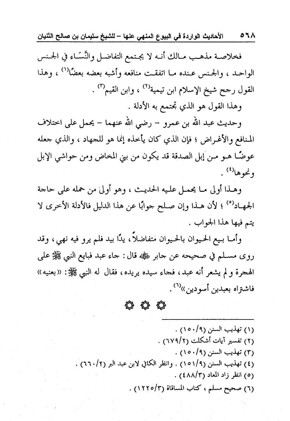 وأما بيع الحيوان بالحيوان متفاضلاً، يدًا بيد فلم يرو فيه نهي، وقد روى مسلم في صحيحه عن جابر رضي الله عنه قال: جاء عبد فبايع النبي صلى الله عليه وسلم على الهجرة ولم يشعر أنه عبد، فجاء سيده يريده، فقال له النبي صلى الله عليه وسلم: "بعنيه" فاشتراه بعبدين أسودين" 6.