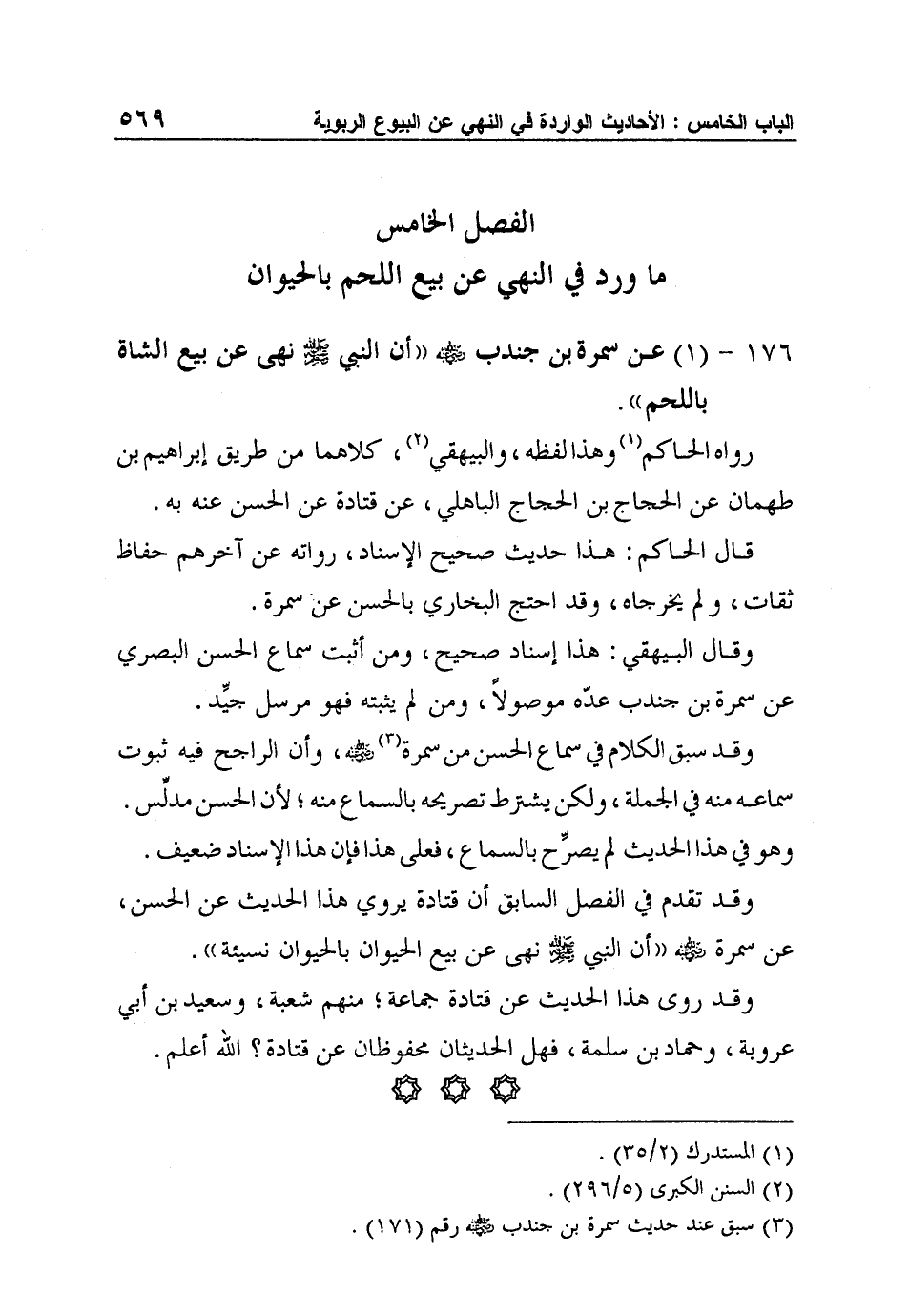 176 - (1) عن سمرة بن جندب رضي الله عنه "أن النبي صلى الله عليه وسلم نهى عن بيع الشاة باللحم".