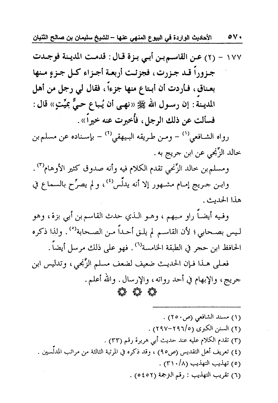 177 - (2) عن القاسم بن أبي بزة قال: قدمت المدينة فوجدت جزوراً قد جزرت، فجزئت أربعة أجزاء كل جزءٍ منها بعناقٍ، فأردت أن أبتاع منها جزءاً، فقال لي رجل من أهل المدينة: إن رسول الله صلى الله عليه وسلم "نهى أن يُباع حيٌّ بميِّتٍ" قال: فسألت عن ذلك الرجل، فأُخبرت عنه خيراً".