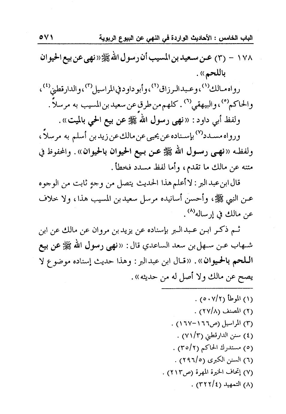 178 - (3) عن سعيد بن المسيب أن رسول الله صلى الله عليه وسلم "نهى عن بيع الحيوان باللحم".