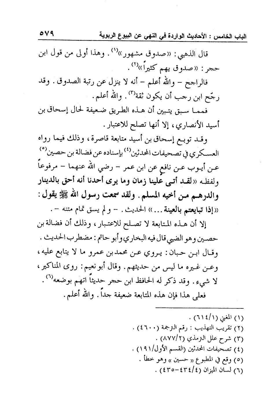 وقد توبع إسحاق بن أسيد متابعة قاصرة، وذلك فيما رواه العسكري في تصحيفات المحدثين4 بإسناده عن فضالة بن حصين5 عن أيوب عن نافعٍ عن ابن عمر - رضي الله عنهما - مرفوعاً ولفظه "لقد أتى علينا زمان وما يرى أحدنا أنه أحق بالدينار والدرهم من أخيه المسلم. ولقد سمعت رسول الله صلى الله عليه وسلم يقول: "إذا تبايعتم بالعينة ... " الحديث. - ولم يسق تمام متنه -.