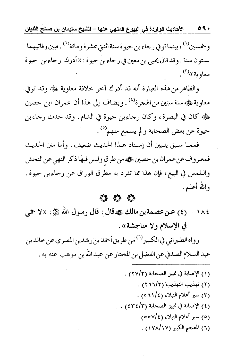 184 - (4) عن عصمة بن مالك رضي الله عنه قال: قال رسول الله صلى الله عليه وسلم: "لا حمى في الإسلام ولا مناجشة".