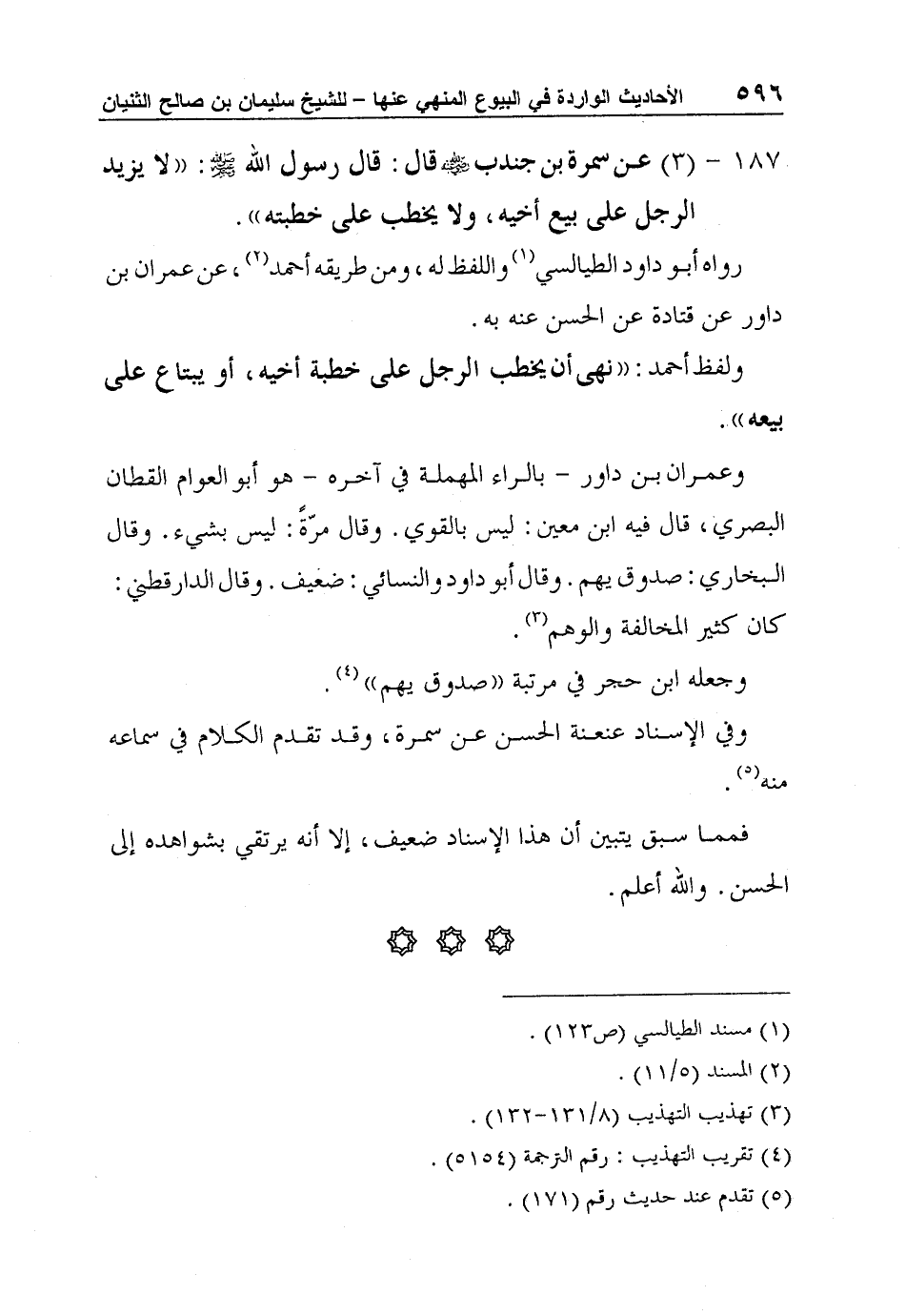 187 - (3) عن سمرة بن جندب رضي الله عنه قال: قال رسول الله صلى الله عليه وسلم: "لا يزيد الرجل على بيع أخيه، ولا يخطب على خطبته".