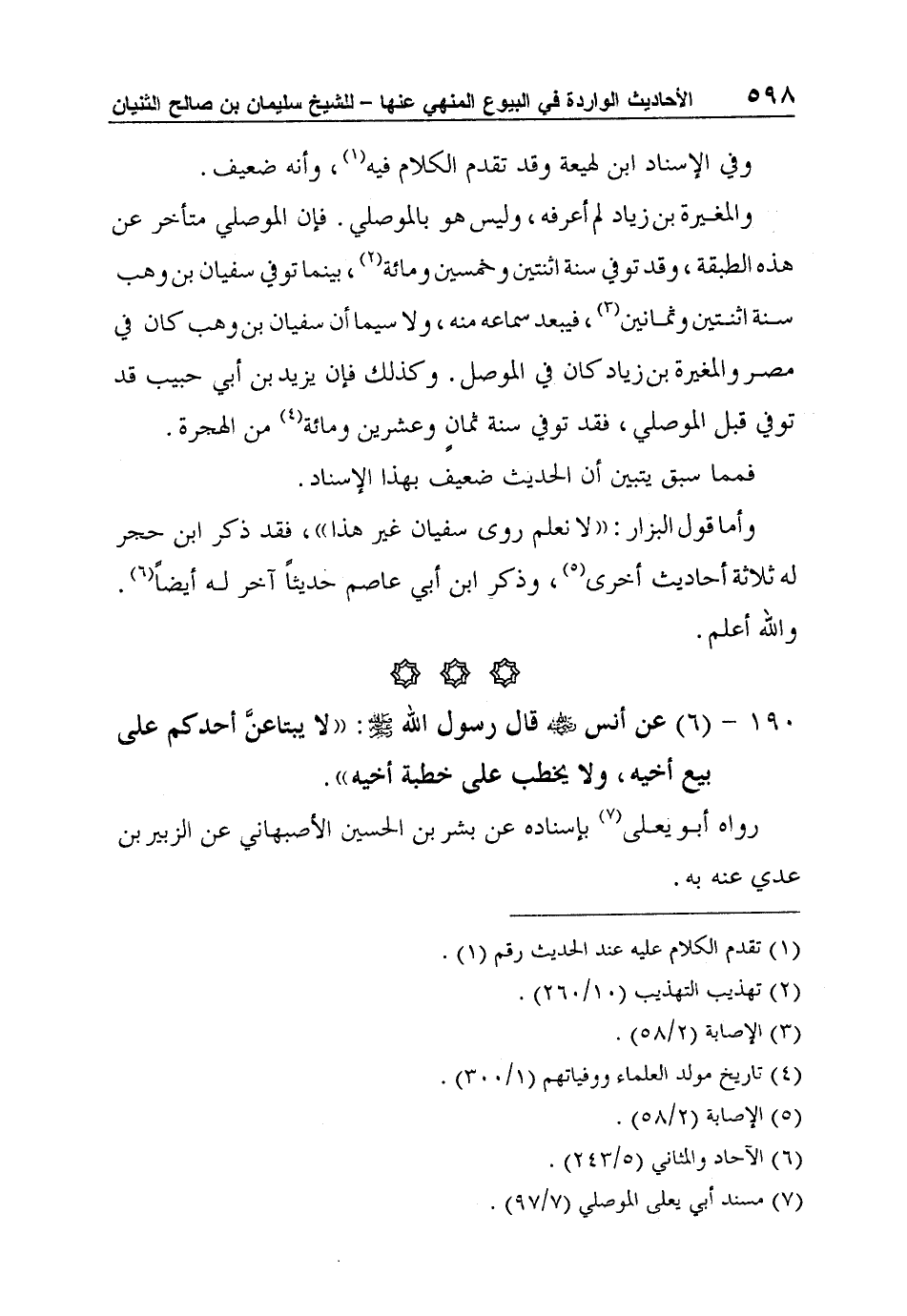 190 - (6) عن أنس رضي الله عنه قال رسول الله صلى الله عليه وسلم: "لا يبتاعنَّ أحدكم على بيع أخيه، ولا يخطب على خطبة أخيه".