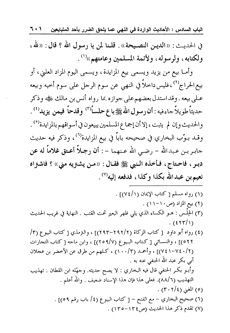 وأما بيع من يزيد ويسمى بيع المزايدة، ويسمى اليوم المزاد العلني، أو بيع الحراج2، فليس داخلاً في النهي عن سوم الرجل على سوم أخيه وبيعه على بيعه. وقد استدل بعضهم على جوازه بما رواه أنس بن مالك رضي الله عنه وذكر حديثاً طويلاً جاء فيه: أن رسول الله صلى الله عليه وسلم باع حلساً3 وقدحاً فيمن يزيد4. والحديث وإن لم يثبت، إلا أن إجماع المسلمين يبيعون في أسواقهم بالمزايدة5. وقد بوّب البخاري في صحيحه باباً في بيع المزايدة6، وذكر فيه حديث جابر بن عبد الله - رضي الله عنهما -: أن رجلاً أعتق غلاماً له عن دبر، فاحتاج، فأخذه النبي صلى الله عليه وسلم فقال: "من يشتريه مني"؟ فاشتراه نعيم بن عبد الله بكذا وكذا، فدفعه إليه7.