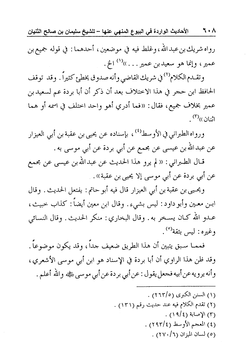 وتقدم الكلام2 في شريك القاضي وأنه صدوق يخطئ كثيراً. وقد توقف الحافظ ابن حجر في هذا الاختلاف بعد أن ذكر أن أبا بردة عم لسعيد بن عمير بخلاف جميع، فقال: "فما أدري أهو واحد اختلف في اسمه أو هما اثنان"3.