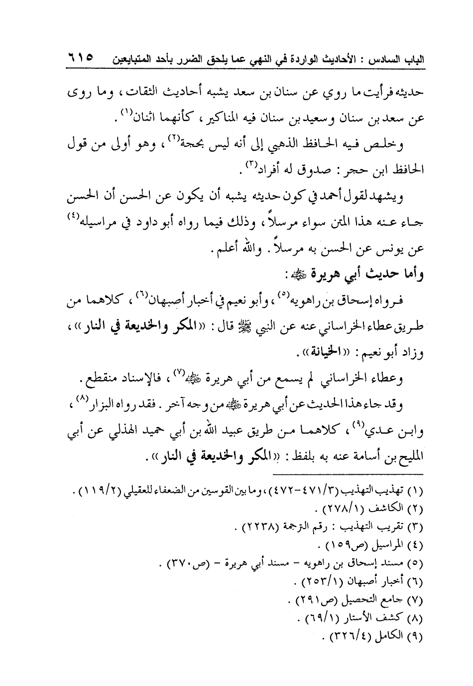 وقد جاء هذا الحديث عن أبي هريرة رضي الله عنه من وجه آخر. فقد رواه البزار8، وابن عدي9، كلاهما من طريق عبيد الله بن أبي حميد الهذلي عن أبي المليح بن أسامة عنه به بلفظ: "المكر والخديعة في النار".