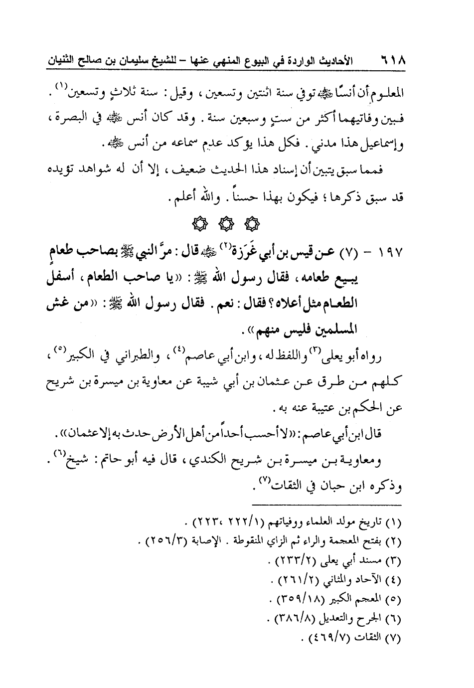 197 - (7) عن قيس بن أبي غَرَزة2 رضي الله عنه قال: مرَّ النبي صلى الله عليه وسلم بصاحب طعامٍ يبيع طعامه، فقال رسول الله صلى الله عليه وسلم: "يا صاحب الطعام، أسفل الطعام مثل أعلاه؟ فقال: نعم. فقال رسول الله صلى الله عليه وسلم: "من غش المسلمين فليس منهم".