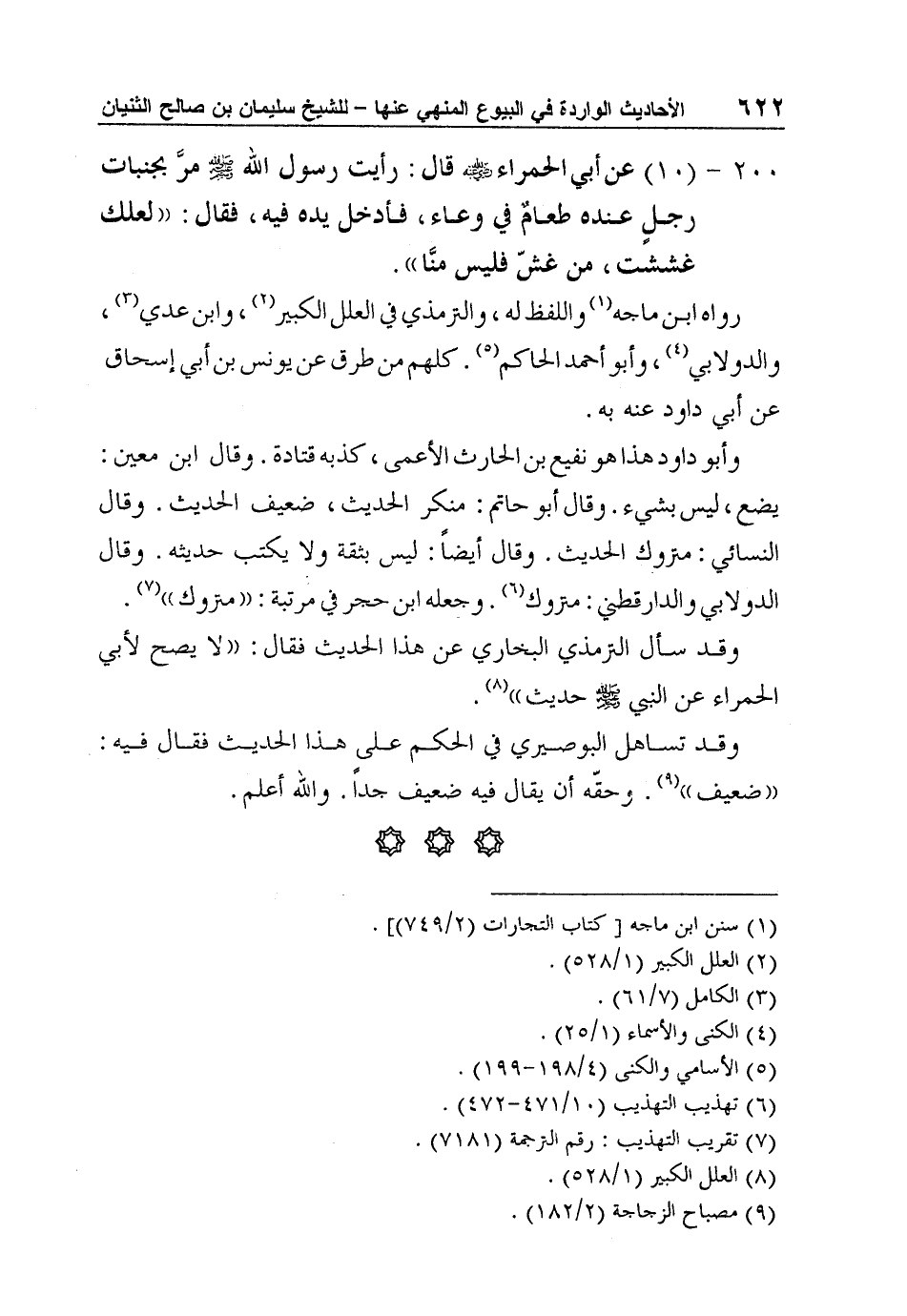 200 - (10) عن أبي الحمراء رضي الله عنه قال: رأيت رسول الله صلى الله عليه وسلم مرَّ بجنبات رجلٍ عنده طعامٌ في وعاء، فأدخل يده فيه، فقال: "لعلك غششت، من غشّ فليس منَّا".