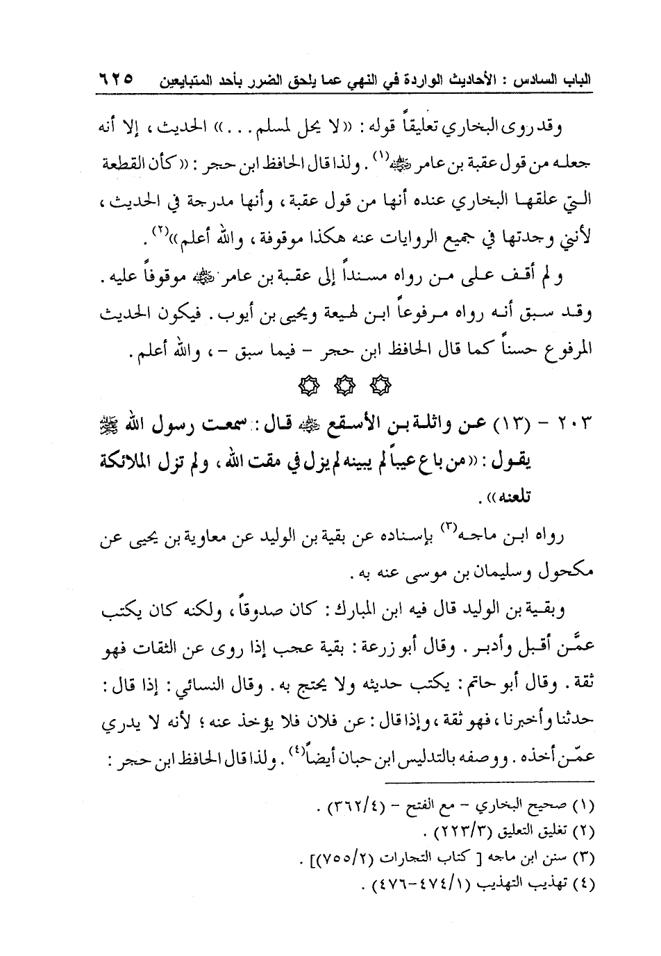 203 - (13) عن واثلة بن الأسقع رضي الله عنه قال: سمعت رسول الله صلى الله عليه وسلم يقول: "من باع عيباً لم يبينه لم يزل في مقت الله، ولم تزل الملائكة تلعنه".