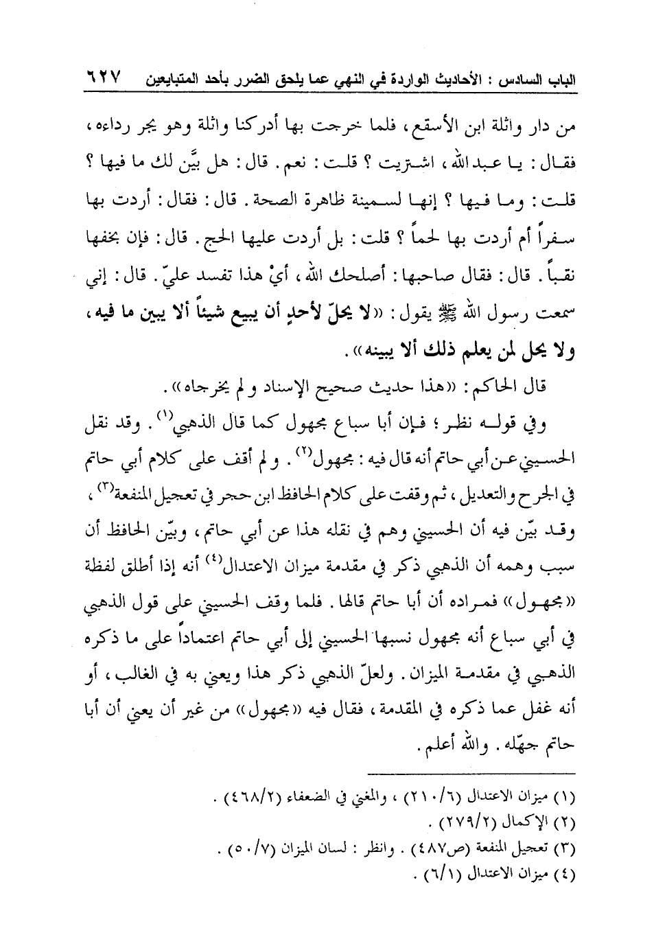 وفي قوله نظر؛ فإن أبا سباع مجهول كما قال الذهبي1. وقد نقل الحسيني عن أبي حاتم أنه قال فيه: مجهول2. ولم أقف على كلام أبي حاتم في الجرح والتعديل، ثم وقفت على كلام الحافظ ابن حجر في تعجيل المنفعة3، وقد بيّن فيه أن الحسيني وهم في نقله هذا عن أبي حاتم، وبيّن الحافظ أن سبب وهمه أن الذهبي ذكر في مقدمة ميزان الاعتدال4 أنه إذا أطلق لفظة "مجهول" فمراده أن أبا حاتم قالها. فلما وقف الحسيني على قول الذهبي في أبي سباع أنه مجهول نسبها الحسيني إلى أبي حاتم اعتماداً على ما ذكره الذهبي في مقدمة الميزان. ولعلّ الذهبي ذكر هذا ويعني به في الغالب، أو أنه غفل عما ذكره في المقدمة، فقال فيه "مجهول" من غير أن يعني أن أبا حاتم جهّله. والله أعلم.
