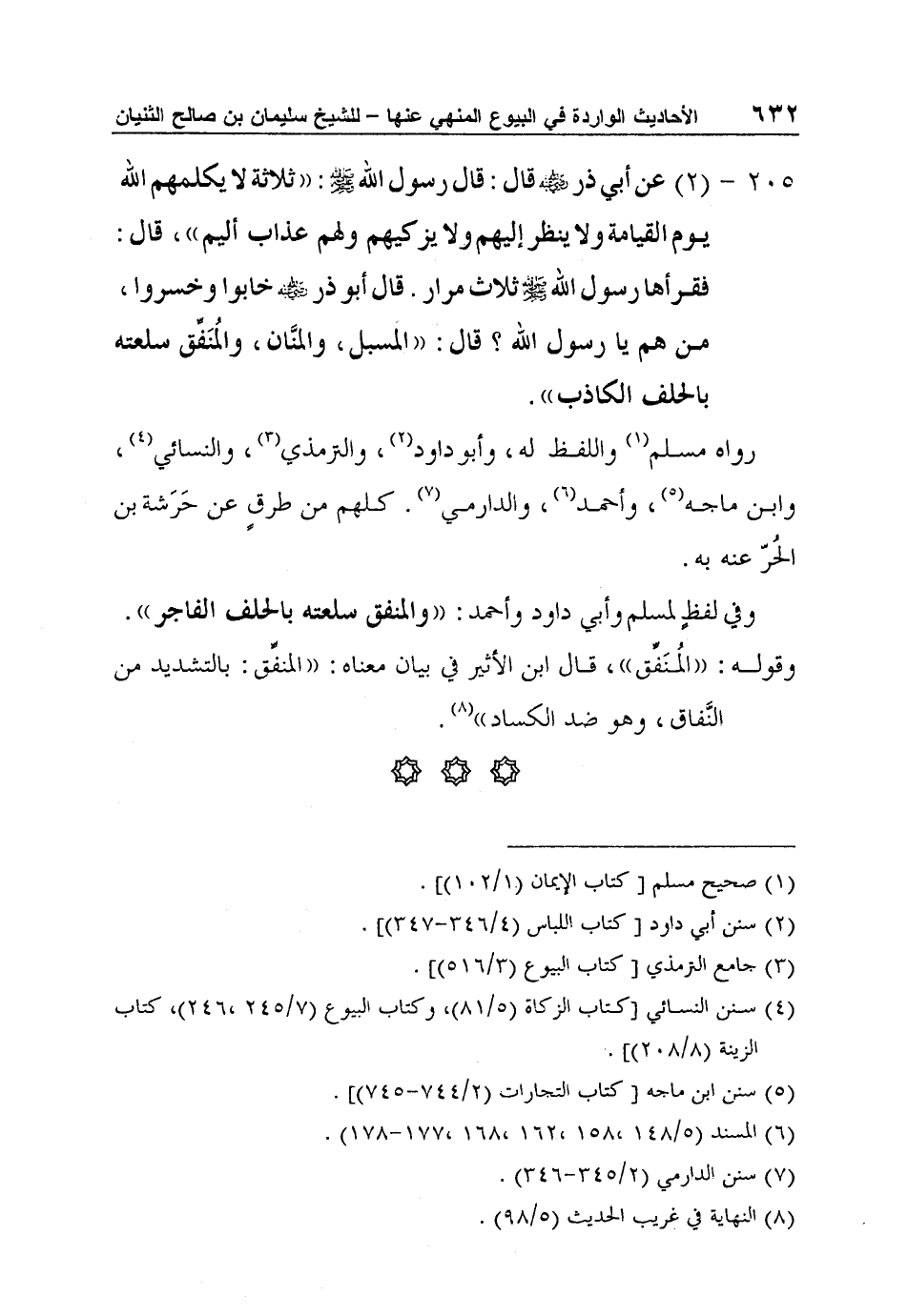 205 - (2) عن أبي ذر رضي الله عنه قال: قال رسول الله صلى الله عليه وسلم: "ثلاثة لا يكلمهم الله يوم القيامة ولا ينظر إليهم ولا يزكيهم ولهم عذاب أليم"، قال: فقرأها رسول الله صلى الله عليه وسلم ثلاث مرار. قال أبو ذر رضي الله عنه خابوا وخسروا، من هم يا رسول الله؟ قال: "المسبل، والمنَّان، والمُنَفِّق سلعته بالحلف الكاذب".