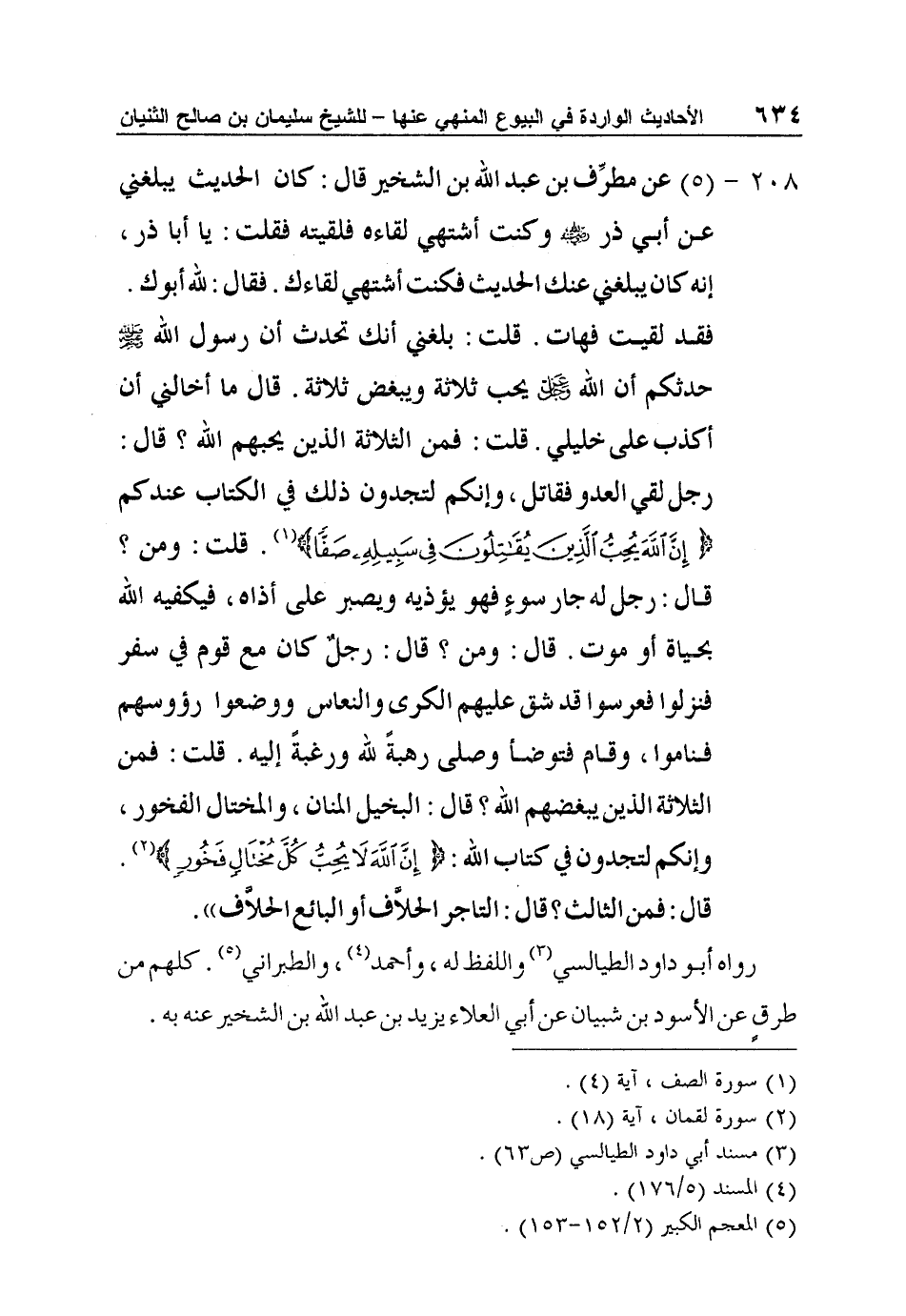 208 - (5) عن مطرِّف بن عبد الله بن الشخير قال: كان الحديث يبلغني عن أبي ذر رضي الله عنه وكنت أشتهي لقاءه فلقيته فقلت: يا أبا ذر، إنه كان يبلغني عنك الحديث فكنت أشتهي لقاءك. فقال: لله أبوك. فقد لقيت فهات. قلت: بلغني أنك تحدث أن رسول الله صلى الله عليه وسلم حدثكم أن الله عز وجل يحب ثلاثة ويبغض ثلاثة. قال ما أخالني أن أكذب على خليلي. قلت: فمن الثلاثة الذين يحبهم الله؟ قال: رجل لقي العدو فقاتل، وإنكم لتجدون ذلك في الكتاب عندكم {إِنَّ اللَّهَ يُحِبُّ الَّذِينَ يُقَاتِلُونَ فِي سَبِيلِهِ صَفّاً} 1. قلت: ومن؟ قال: رجل له جار سوءٍ فهو يؤذيه ويصبر على أذاه، فيكفيه الله بحياة أو موت. قال: ومن؟ قال: رجلٌ كان مع قوم في سفر فنزلوا فعرسوا قد شق عليهم الكرى والنعاس ووضعوا رؤوسهم فناموا، وقام فتوضأ وصلى رهبةً لله ورغبةً إليه. قلت: فمن الثلاثة الذين يبغضهم الله؟ قال: البخيل المنان، والمختال الفخور، وإنكم لتجدون في كتاب الله: {إِنَّ اللَّهَ لا يُحِبُّ كُلَّ مُخْتَالٍ فَخُورٍٍٍٍٍٍٍٍٍٍٍٍٍِ} 2. قال: فمن الثالث؟ قال: التاجر الحلاَّف أو البائع الحلاَّف ".