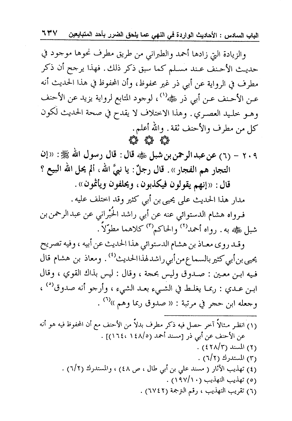 209 - (6) عن عبد الرحمن بن شبل رضي الله عنه قال: قال رسول الله صلى الله عليه وسلم: "إن التجار هم الفجار". قال رجلٌ: يا نبيَّ الله، ألم يحل الله البيع؟ قال: "إنهم يقولون فيكذبون، ويحلفون ويأثمون".