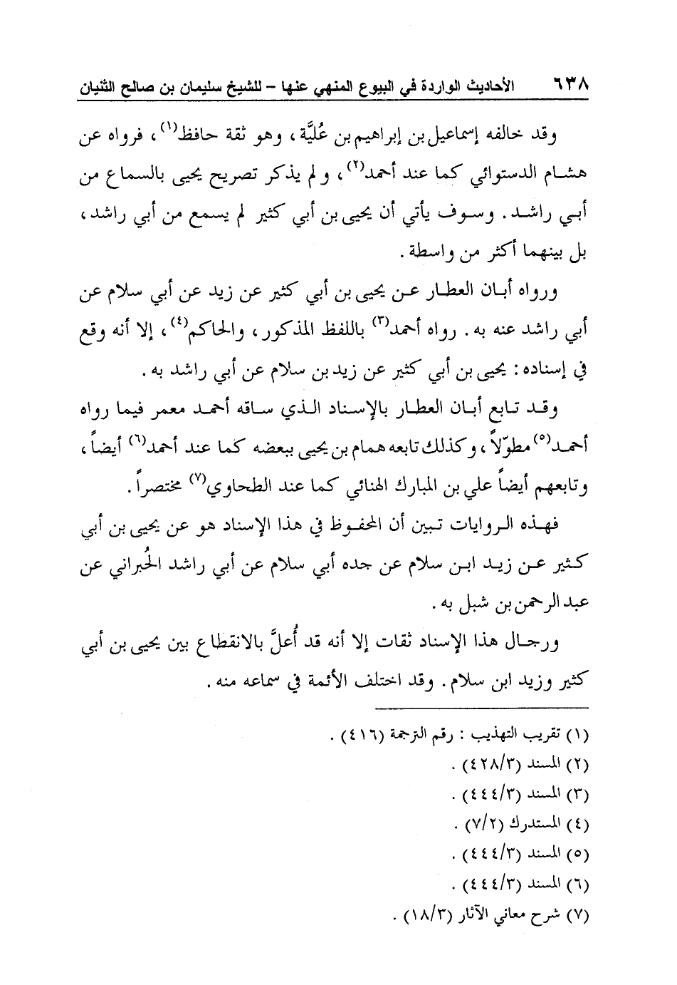 وقد خالفه إسماعيل بن إبراهيم بن عُليَّة، وهو ثقة حافظ1، فرواه عن هشام الدستوائي كما عند أحمد2، ولم يذكر تصريح يحيى بالسماع من أبي راشد. وسوف يأتي أن يحيى بن أبي كثير لم يسمع من أبي راشد، بل بينهما أكثر من واسطة.