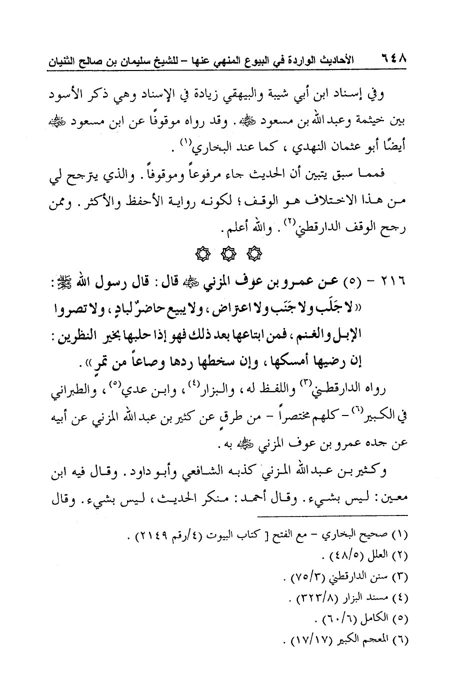 216 - (5) عن عمرو بن عوف المزني رضي الله عنه قال: قال رسول الله صلى الله عليه وسلم: "لا جَلَب ولا جَنَب ولا اعتراض، ولا يبيع حاضرٌ لبادٍ، ولا تصروا الإبل والغنم، فمن ابتاعها بعد ذلك فهو إذا حلبها بخير النظرين: إن رضيها أمسكها، وإن سخطها ردها وصاعاً من تمرٍ".