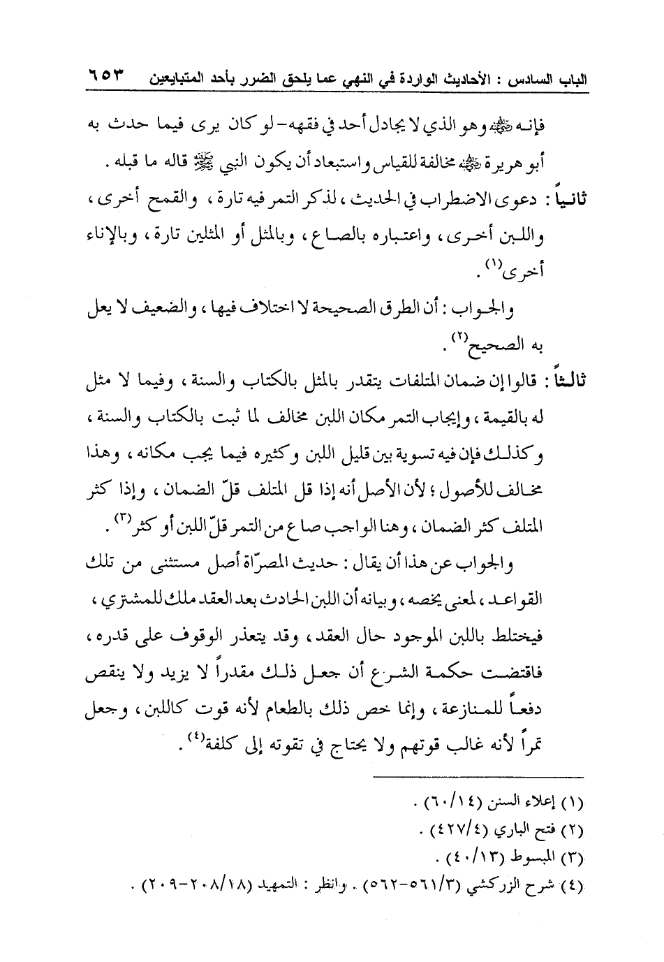 ثالثاً: قالوا إن ضمان المتلفات يتقدر بالمثل بالكتاب والسنة، وفيما لا مثل له بالقيمة، وإيجاب التمر مكان اللبن مخالف لما ثبت بالكتاب والسنة، وكذلك فإن فيه تسوية بين قليل اللبن وكثيره فيما يجب مكانه، وهذا مخالف للأصول؛ لأن الأصل أنه إذا قل المتلف قلّ الضمان، وإذا كثر المتلف كثر الضمان، وهنا الواجب صاع من التمر قلّ اللبن أو كثر3.