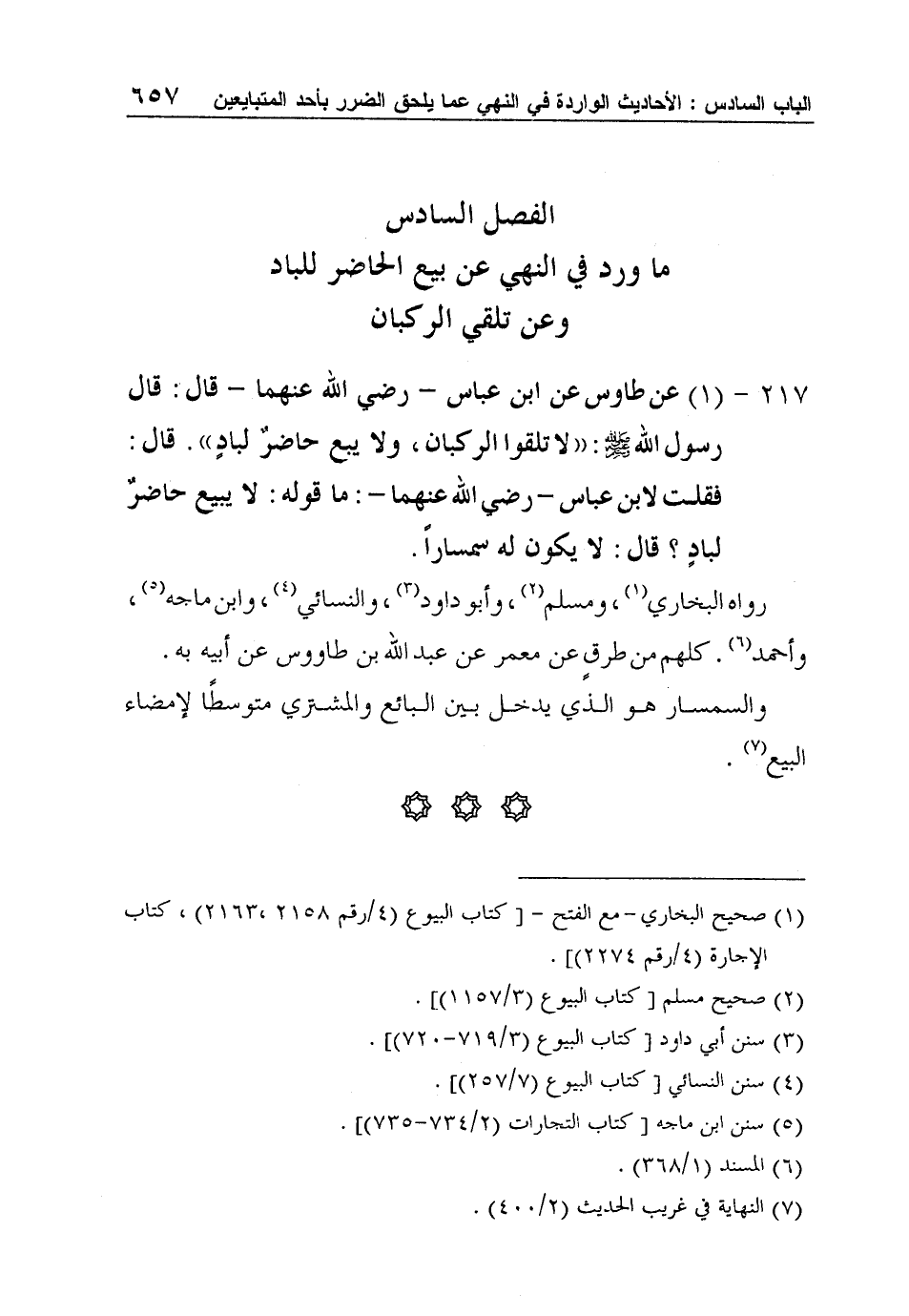 الفصل السادس: ما ورد في النهي عن بيع الحاضر للباد وعن تلقي الركبان