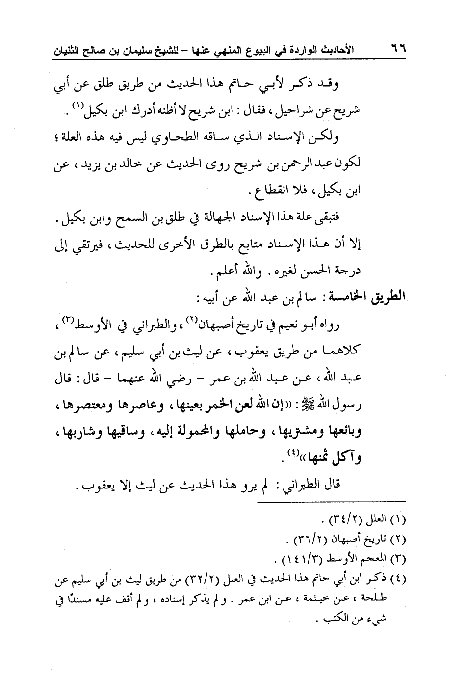 4 ذكر ابن أبي حاتم هذا الحديث في العلل (2/32) من طريق ليث بن أبي سليم عن طلحة، عن خيثمة، عن ابن عمر. ولم يذكر إسناده، ولم أقف عليه مسندًا في شيء من الكتب.