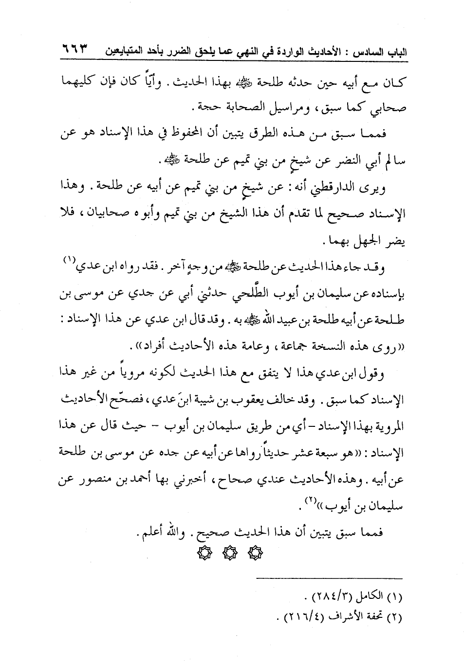 وقول ابن عدي هذا لا يتفق مع هذا الحديث لكونه مروياً من غير هذا الإسناد كما سبق. وقد خالف يعقوب بن شيبة ابنَ عدي، فصحّح الأحاديث المروية بهذا الإسناد - أي من طريق سليمان بن أيوب - حيث قال عن هذا الإسناد: "هو سبعة عشر حديثاً رواها عن أبيه عن جده عن موسى بن طلحة عن أبيه. وهذه الأحاديث عندي صحاح، أخبرني بها أحمد بن منصور عن سليمان بن أيوب"2.