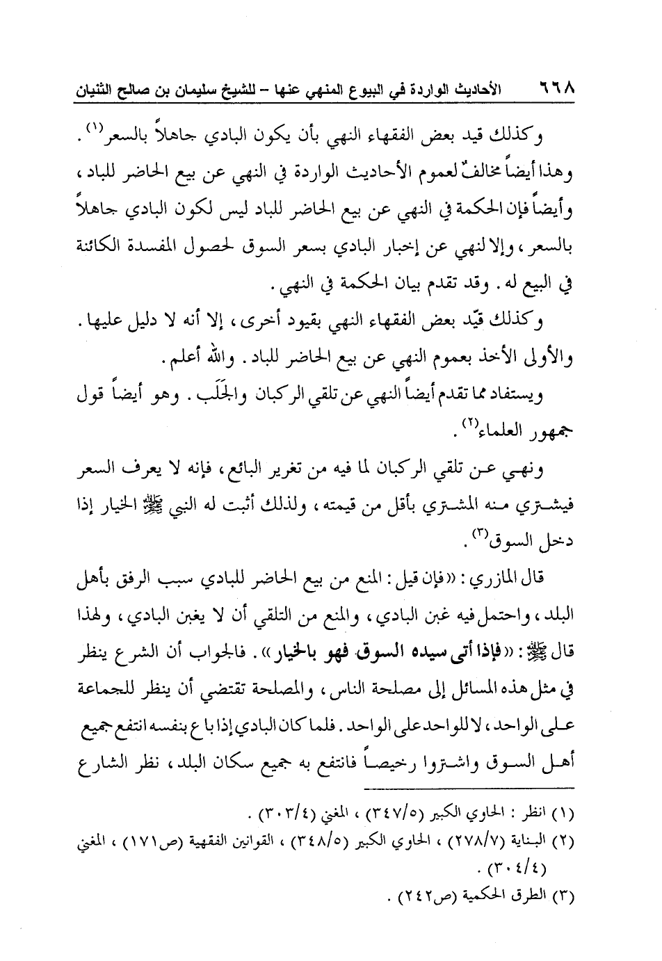 وكذلك قيد بعض الفقهاء النهي بأن يكون البادي جاهلاً بالسعر1. وهذا أيضاً مخالفٌ لعموم الأحاديث الواردة في النهي عن بيع الحاضر للباد، وأيضاً فإن الحكمة في النهي عن بيع الحاضر للباد ليس لكون البادي جاهلاً بالسعر، وإلا لنهي عن إخبار البادي بسعر السوق لحصول المفسدة الكائنة في البيع له. وقد تقدم بيان الحكمة في النهي.