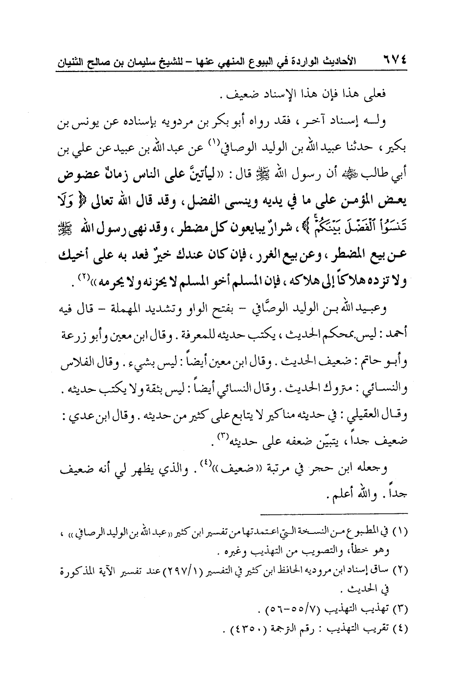 وعبيد الله بن الوليد الوصَّافي - بفتح الواو وتشديد المهملة - قال فيه أحمد: ليس بمحكم الحديث، يكتب حديثه للمعرفة. وقال ابن معين وأبو زرعة وأبو حاتم: ضعيف الحديث. وقال ابن معين أيضاً: ليس بشيء. وقال الفلاس والنسائي: متروك الحديث. وقال النسائي أيضاً: ليس بثقة ولا يكتب حديثه. وقال العقيلي: في حديثه مناكير لا يتابع على كثير من حديثه. وقال ابن عدي: ضعيف جداً، يتبيّن ضعفه على حديثه3.