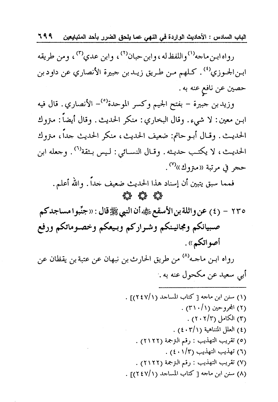 235 - (4) عن واثلة بن الأسقع رضي الله عنه أن النبي صلى الله عليه وسلم قال: "جنِّبوا مساجدكم صبيانكم ومجانينكم وشراركم وبيعكم وخصوماتكم ورفع أصواتكم".