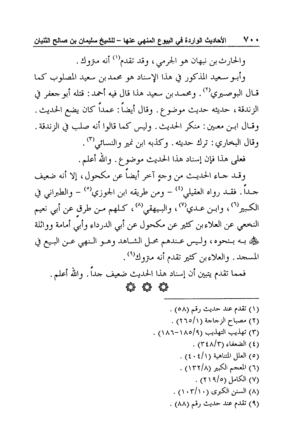 وأبو سعيد المذكور في هذا الإسناد هو محمد بن سعيد المصلوب كما قال البوصيري2. ومحمد بن سعيد هذا قال فيه أحمد: قتله أبو جعفر في الزندقة، حديثه حديث موضوع. وقال أيضاً: عمداً كان يضع الحديث. وقال ابن معين: منكر الحديث. وليس كما قالوا أنه صلب في الزندقة. وقال البخاري: ترك حديثه. وكذبه ابن نمير والنسائي3.