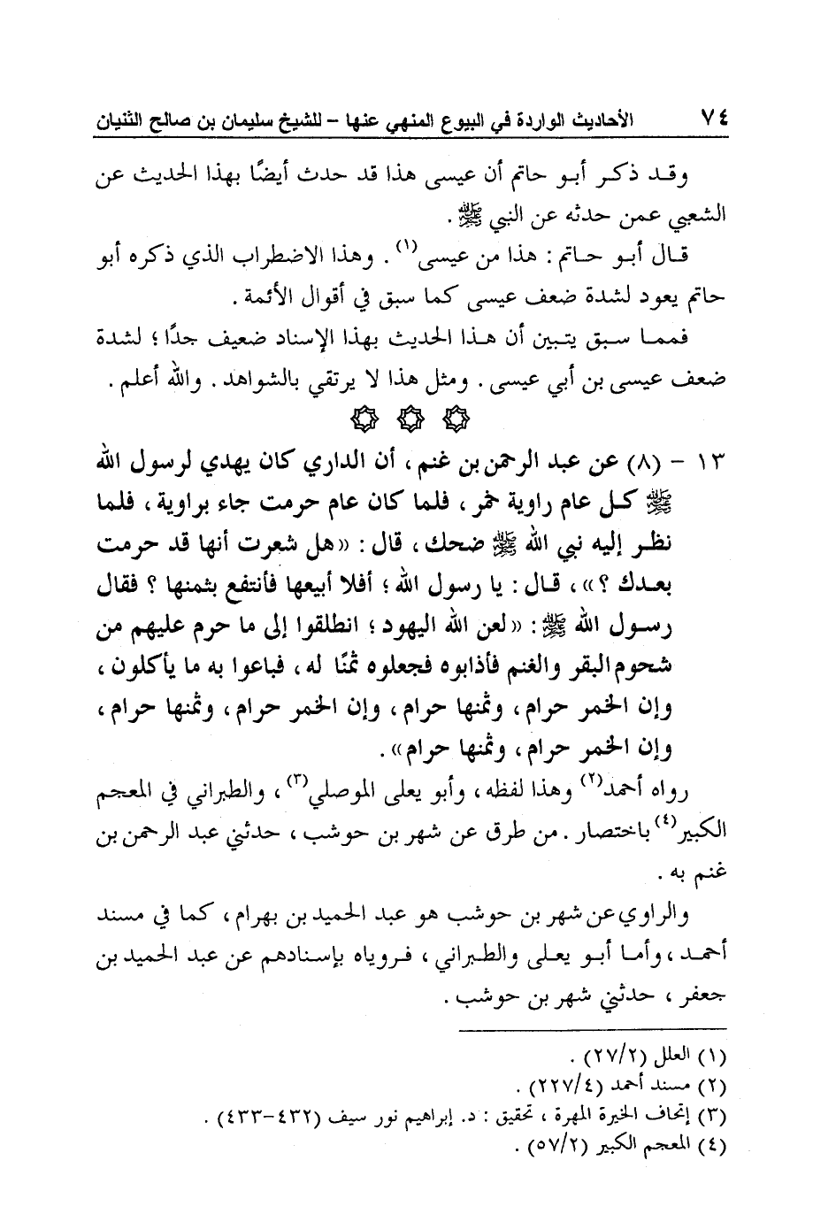 13 - (8) عن عبد الرحمن بن غنم، أن الداري كان يهدي لرسول الله صلى الله عليه وسلم كل عام راوية خمر، فلما كان عام حرمت جاء براوية، فلما نظر إليه نبي الله صلى الله عليه وسلم ضحك، قال: " هل شعرت أنها قد حرمت بعدك؟ "، قال: يا رسول الله؛ أفلا أبيعها فأنتفع بثمنها؟ فقال رسول الله صلى الله عليه وسلم: " لعن الله اليهود؛ انطلقوا إلى ما حرم عليهم من شحوم البقر والغنم فأذابوه فجعلوه ثمنًا له، فباعوا به ما يأكلون، وإن الخمر حرام، وثمنها حرام، وإن الخمر حرام، وثمنها حرام، وإن الخمر حرام، وثمنها حرام".