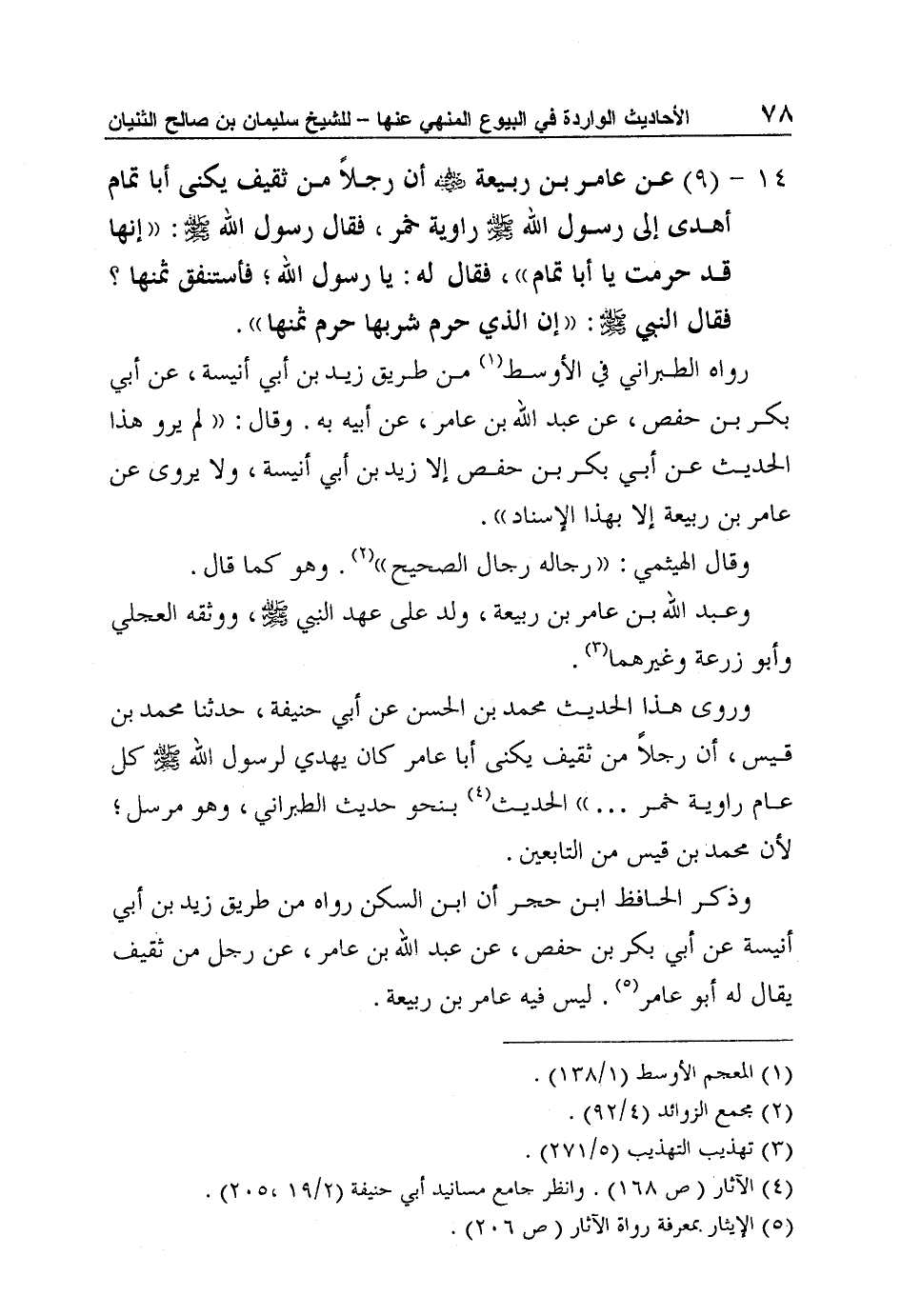 14 - (9) عن عامر بن ربيعة رضي الله عنه أن رجلاً من ثقيف يكنى أبا تمام أهدى إلى رسول الله صلى الله عليه وسلم راوية خمر، فقال رسول الله صلى الله عليه وسلم: