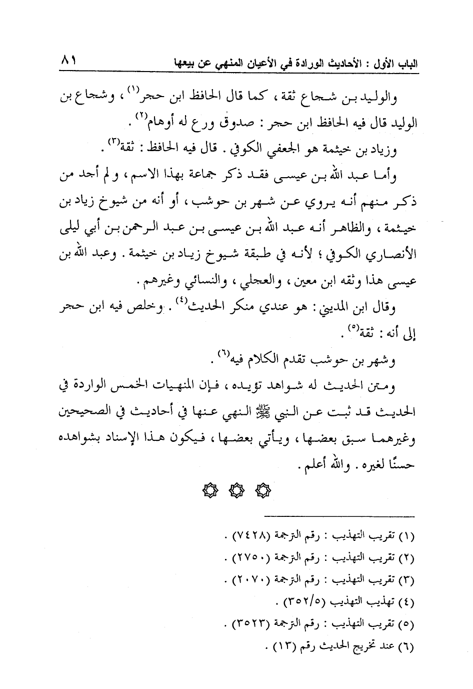 ومتن الحديث له شواهد تؤيده، فإن المنهيات الخمس الواردة في الحديث قد ثبت عن النبي صلى الله عليه وسلم النهي عنها في أحاديث في الصحيحين وغيرهما سبق بعضها، ويأتي بعضها، فيكون هذا الإسناد بشواهده حسنًا لغيره. والله أعلم.
