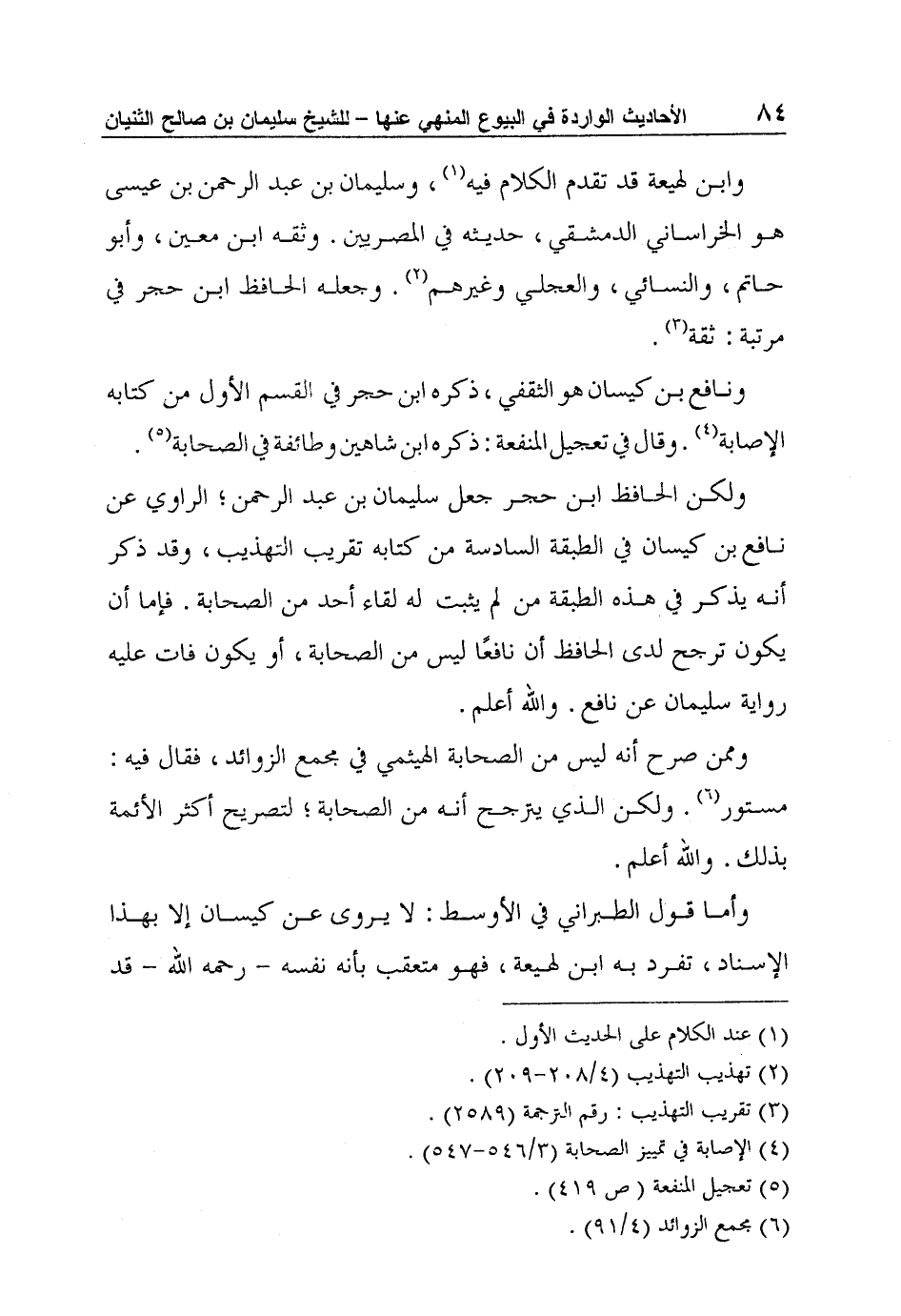 ولكن الحافظ ابن حجر جعل سليمان بن عبد الرحمن؛ الراوي عن نافع بن كيسان في الطبقة السادسة من كتابه تقريب التهذيب، وقد ذكر أنه يذكر في هذه الطبقة من لم يثبت له لقاء أحد من الصحابة. فإما أن يكون ترجح لدى الحافظ أن نافعًا ليس من الصحابة، أو يكون فات عليه رواية سليمان عن نافع. والله أعلم.