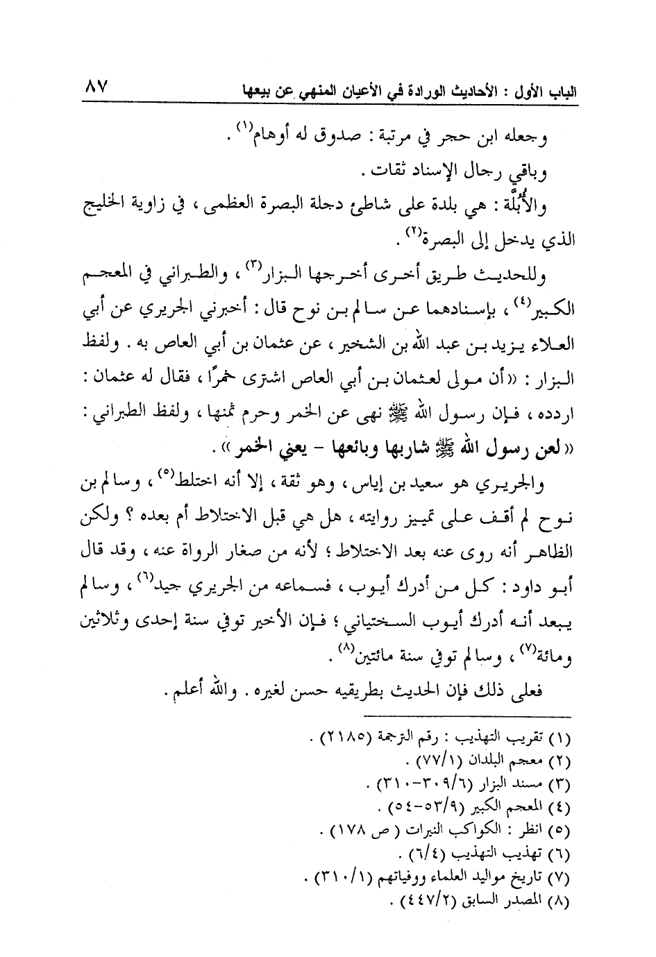 وللحديث طريق أخرى أخرجها البزار3، والطبراني في المعجم الكبير4، بإسنادهما عن سالم بن نوح قال: أخبرني الجريري عن أبي العلاء يزيد بن عبد الله بن الشخير، عن عثمان بن أبي العاص به. ولفظ البزار: " أن مولى لعثمان بن أبي العاص اشترى خمرًا، فقال له عثمان: اردده، فإن رسول الله صلى الله عليه وسلم نهى عن الخمر وحرم ثمنها، ولفظ الطبراني: "لعن رسول الله صلى الله عليه وسلم شاربها وبائعها - يعني الخمر".