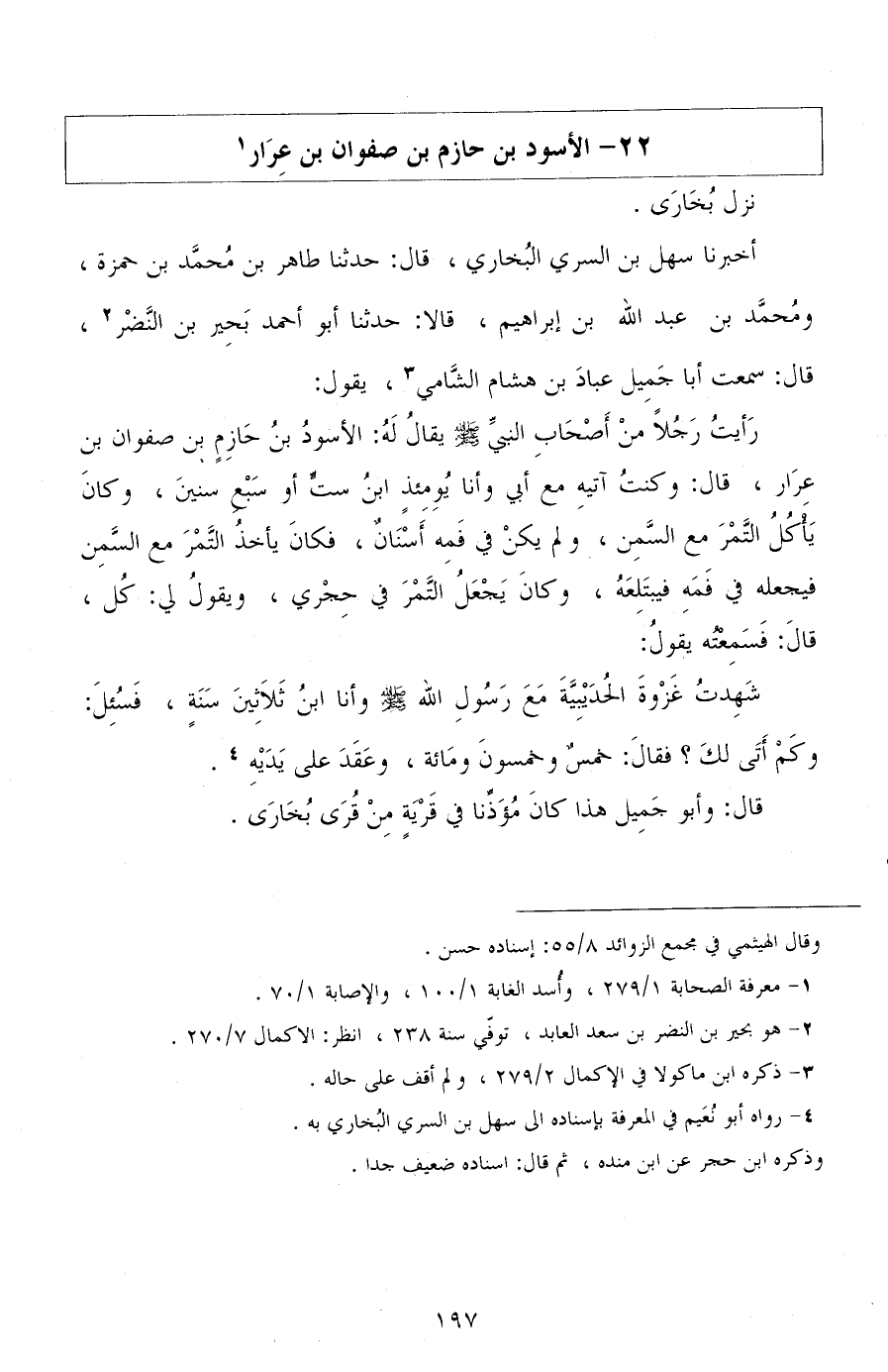 أخبرنا سهل بن السري البخاري، قال: حدثنا طاهر بن محمد بن حمزة، ومحمد بن عبد الله بن إبراهيم، قالا: حدثنا أبو أحمد بحير بن النضر، قال: سمعت أبا جميل عباد بن هشام الشامي، يقول: رأيت رجلا من أصحاب النبي صلى الله عليه وسلم يقال له: الأسود بن حازم بن صفوان بن عرار، قال: وكنت آتيه مع أبي وأنا يومئذ ابن ست أو سبع سنين، وكان يأكل التمر مع السمن، ولم يكن في فمه أسنان، فكان يأخذ التمر مع السمن فيجعله في فمه فيبتلعه، وكان يجعل التمر في حجري، ويقول لي: كل، قال: فسمعته يقول: شهدت غزوة الحديبية مع رسول الله صلى الله عليه وسلم وأنا ابن ثلاثين سنة، فسئل: وكم أتى لك؟ فقال: خمس وخمسون ومائة، وعقد على يديه.