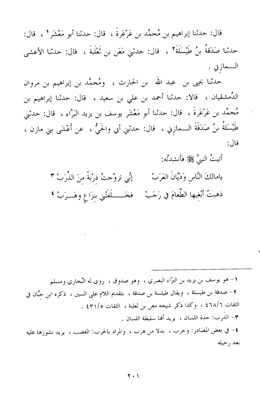 قال: حدثنا إبراهيم بن محمد بن عرعرة، قال: حدثنا أبو معشر، قال: حدثنا صدقة بن طيسلة، قال: حدثني معن بن ثعلبة، قال: حدثنا الأعشى المازني.