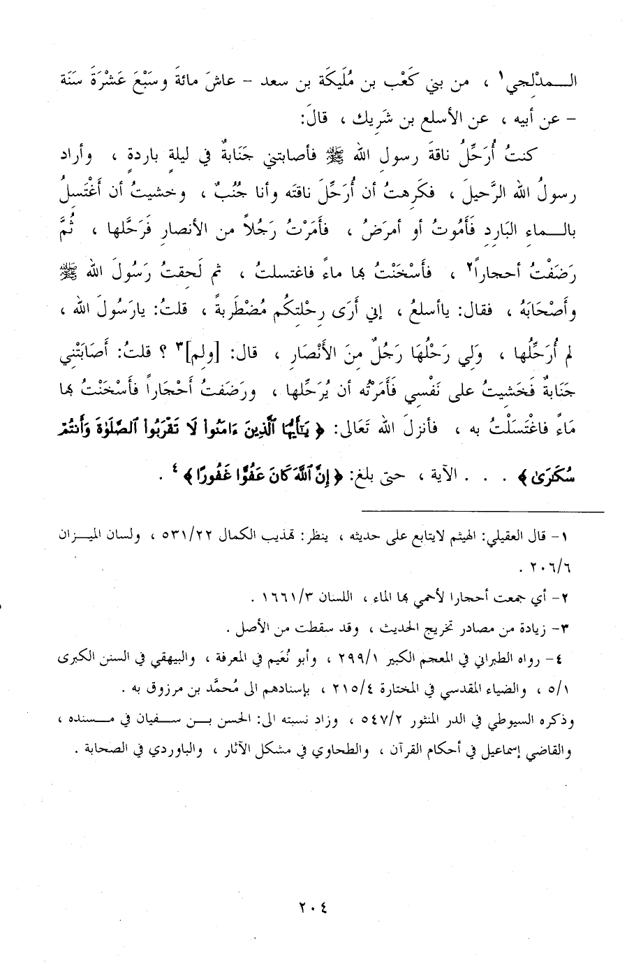 المدلجي، من بني كعب بن مليكة بن سعد عاش مائة وسبع عشرة سنة، عن أبيه، عن الأسلع بن شريك، قال: كنت أرحل ناقة رسول الله صلى الله عليه وسلم فأصابتني جنابة في ليلة باردة، وأراد رسول الله الرحيل، فكرهت أن أرحل ناقته وأنا جنب، وخشيت أن أغتسل بالماء البارد فأموت أو أمرض، فأمرت رجلا من الأنصار فرحلها، ثم رضفت أحجارًا، فأسخنت بها ماء فاغتسلت، ثم لحقت رسول الله صلى الله عليه وسلم وأصحابه، فقال: يا أسلع، إني أرى رحلتكم مضطربة، قلت: يا رسول الله، لم أرحلها، ولي رحلها رجل من الأنصار، قال: ولم؟ قلت: أصابتني جنابة فخشيت على نفسي فأمرته أن يرحلها، ورضفت أحجارًا فأسخنت بها ماء فاغتسلت به، فأنزل الله تعالى: {يَأَيُّهَا الَّذِينَ آمَنُوا لا تَقْرَبُوا الصَّلاةَ وَأَنْتُمْ سُكَارَى} [النساء: ٤٣] . ..