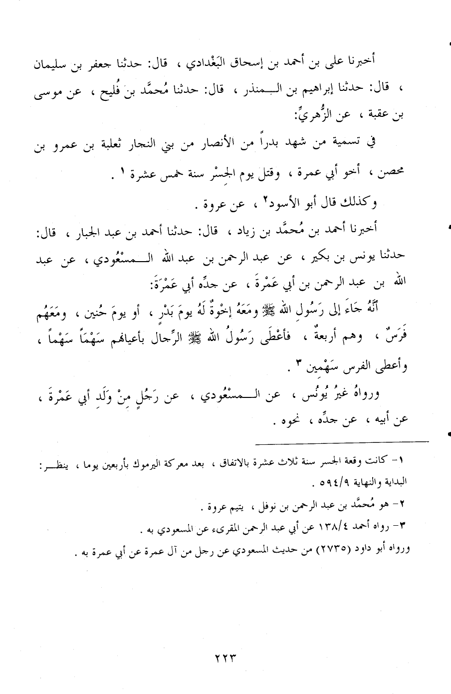أخبرنا أحمد بن محمد بن زياد، قال: حدثنا أحمد بن عبد الجبار، قال: حدثنا يونس بن بكير، عن عبد الرحمن بن عبد الله المسعودي، عن عبد الله بن عبد الرحمن بن أبي عمرة، عن جده أبي عمرة: أنه جاء إلى رسول الله صلى الله عليه وسلم ومعه إخوة له يوم بدر أو يوم حنين ومعهم فرس وهم أربعة، فأعطى رسول الله صلى الله عليه وسلم الرجال بأعيانهم سهمًا سهمًا، وأعطى الفرس سهمين.