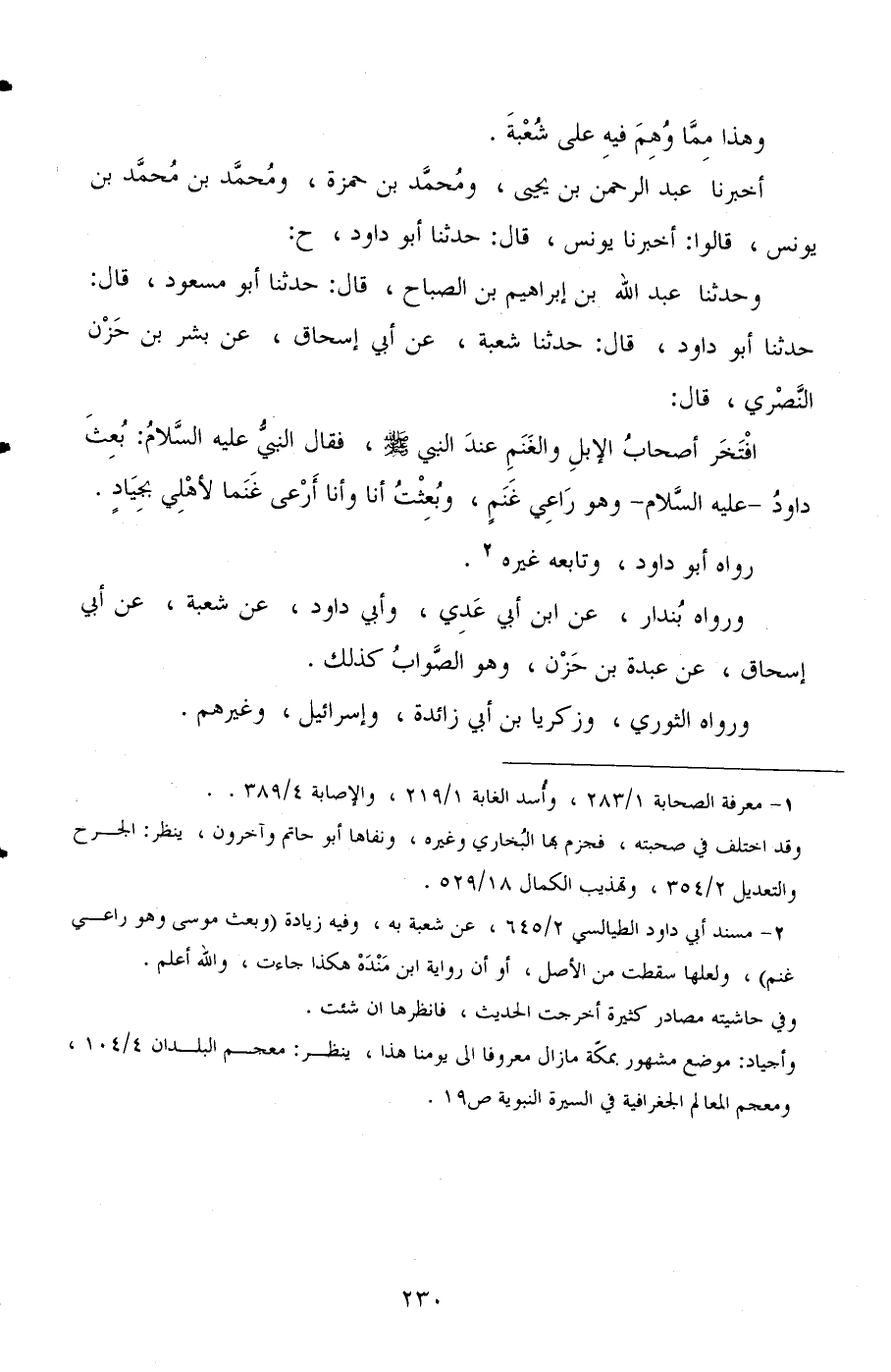 أخبرنا عبد الرحمن بن يحيى، ومحمد بن حمزة، ومحمد بن محمد بن يونس، قالوا: أخبرنا يونس، قال: حدثنا أبو داود، ح: وحدثنا عبد الله بن إبراهيم بن الصباح، قال: حدثنا أبو مسعود، قال: حدثنا أبو داود، قال: حدثنا شعبة، عن أبي إسحاق، عن بشر بن حزن النصري، قال: افتخر أصحاب الإبل والغنم عند النبي صلى الله عليه وسلم، فقال النبي عليه السلام: «بعث داود عليه السلام وهو راعي غنم، وبعثت أنا وأنا أرعى غنما لأهلي بجياد» .