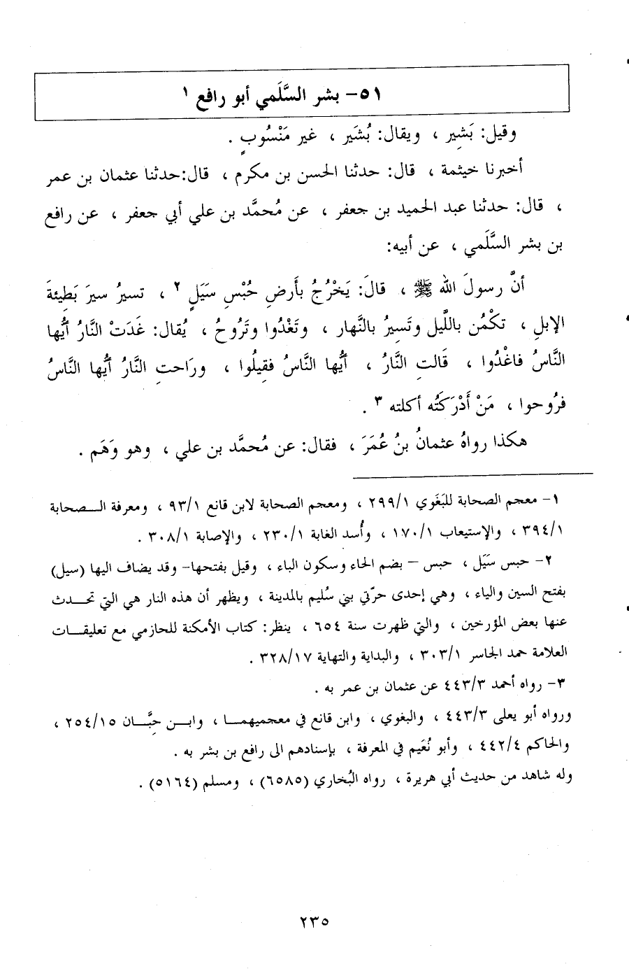 أخبرنا خيثمة، قال: حدثنا الحسن بن مكرم، قال: حدثنا عثمان بن عمر، قال: حدثنا عبد الحميد بن جعفر، عن محمد بن علي أبي جعفر، عن رافع بن بشر السلمي، عن أبيه: أن رسول الله صلى الله عليه وسلم، قال: " يخرج بأرض حبس سيل، تسير سير بطيئة الإبل، تكمن بالليل وتسير بالنهار، وتغدوا وتروح، يقال: غدت النار أيها الناس فاغدوا، قَالَتِ النار، أيها الناس فقيلوا، وراحت النار أيها الناس فروحوا، من أدركته أكلته ".