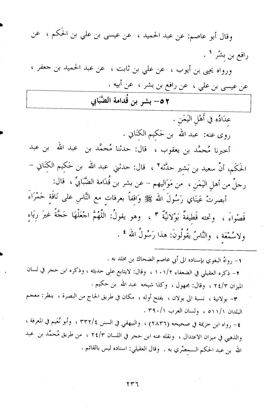 أخبرنا محمد بن يعقوب، قال: حدثنا محمد بن عبد الله بن عبد الحكم، أن سعيد بن بشير حدثه، قال: حدثني عبد الله بن حكيم الكناني رجل من أهل اليمن، من مواليهم، عن بشر بن قدامة الضبابي، قال: أبصرت عيناي رسول الله صلى الله عليه وسلم واقفًا بعرفات مع الناس على ناقة حمراء قصواء، وتحته قطيفة بولانية، وهو يقول: اللهم اجعلها حجة غير رياء ولا سمعة، والناس يقولون: هذا رسول الله.