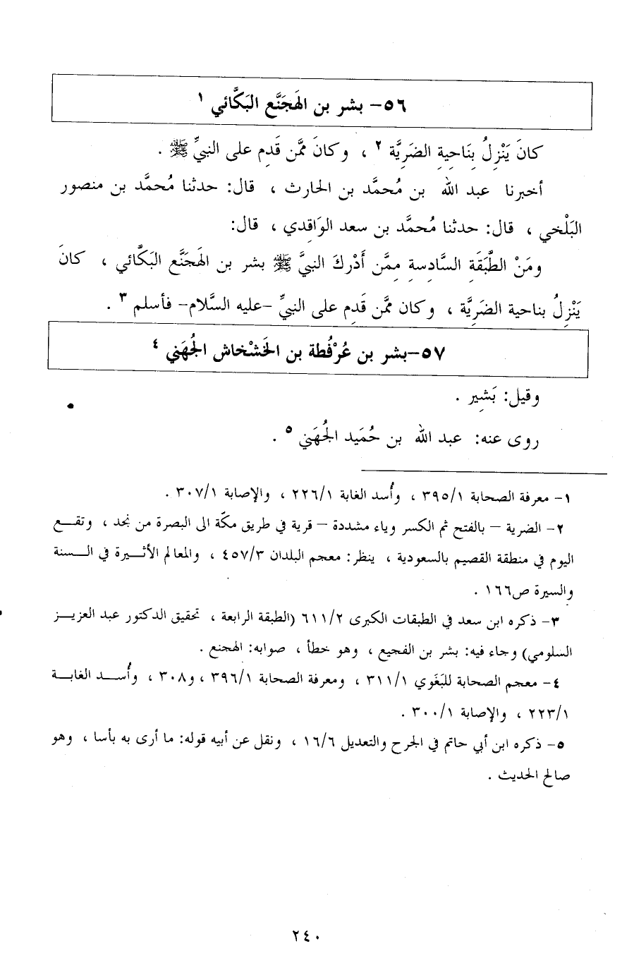 أخبرنا عبد الله بن محمد بن الحارث، قال: حدثنا محمد بن منصور البلخي، قال: حدثنا محمد بن سعد الواقدي، قال: ومن الطبقة السادسة ممن أدرك النبي صلى الله عليه وسلم بشر بن الهجنع البكائي، كان ينزل بناحية الضرية، وكان ممن قدم على النبي عليه السلام فأسلم.