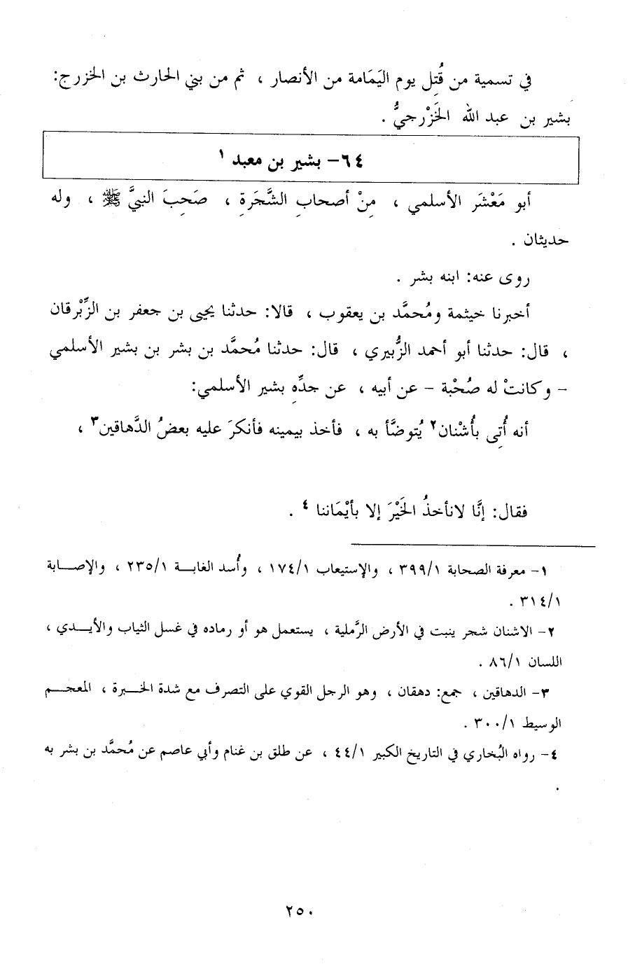 أخبرنا خيثمة ومحمد بن يعقوب، قالا: حدثنا يحيى بن جعفر بن الزبرقان، قال: حدثنا أبو أحمد الزبيري، قال: حدثنا محمد بن بشر بن بشير الأسلمي وكانت له صحبة، عن أبيه، عن جده بشير الأسلمي: " أنه أتي بأشنان يتوضأ به، فأخذ بيمينه، فأنكر عليه بعض الدهاقين، فقال: إنا لا نأخذ الخير إلا بأيماننا ".